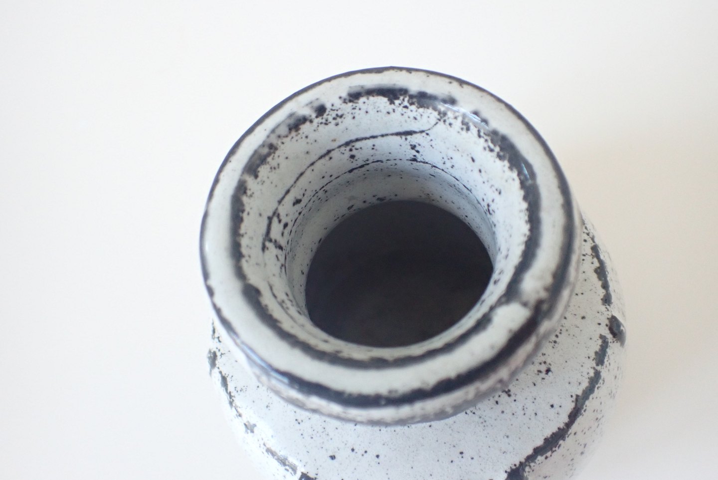 Beskrivelse: Svend Hammershøj (1873 - 1948) for Kähler. Buttet keramikvase i sort/hvid dobbeltglasur(askeglasur).Med smallere kantet hals og små dekorative "ører". Stemplet HAK, Denmark. Højde: 19,5 cm. I fin stand.