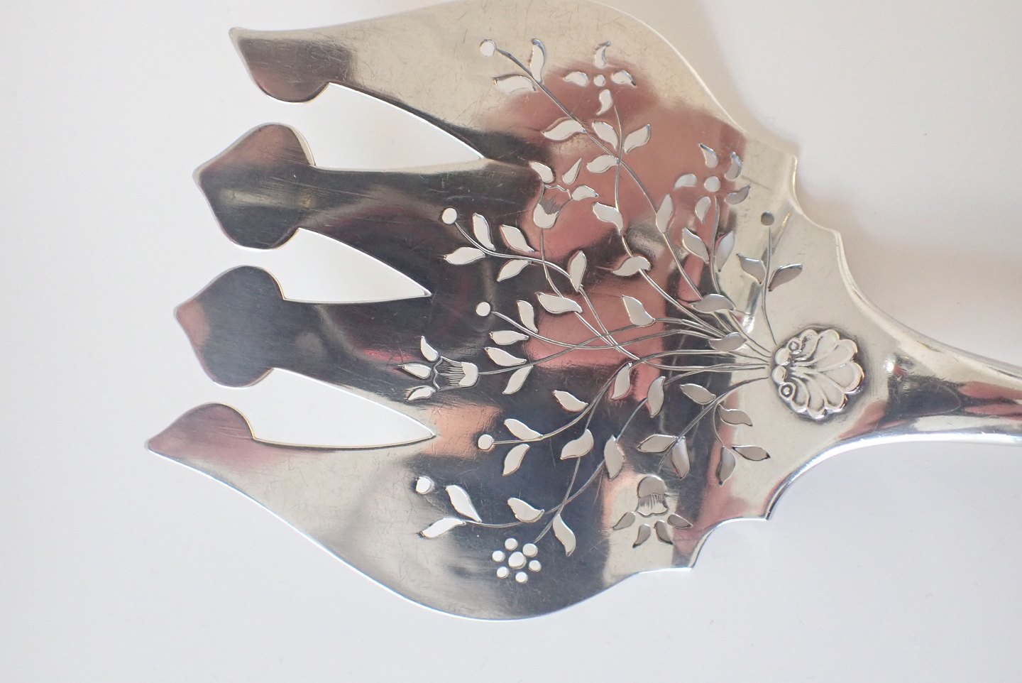 Beskrivelse: Holger Kyster (1898 - 1944) - fiskespade i 825 sølv med perforeret og påsat blomstermotiv. Stemplet Holger Kyster og 2 gange fuglen fra Kolding byvåben. Vægt 106 gram. Længde: 23,2 cm.