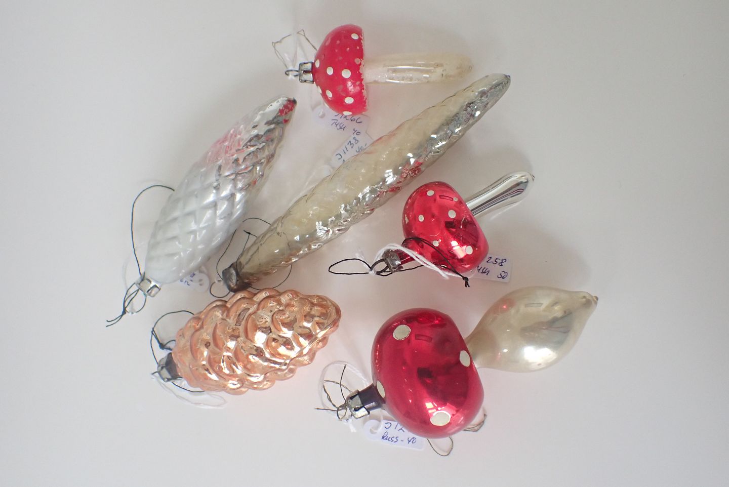 6 stk. glasjulepynt - naturfigurer - kogler og paddehatte. Sælges individuelt. Den store svampe er solgt.