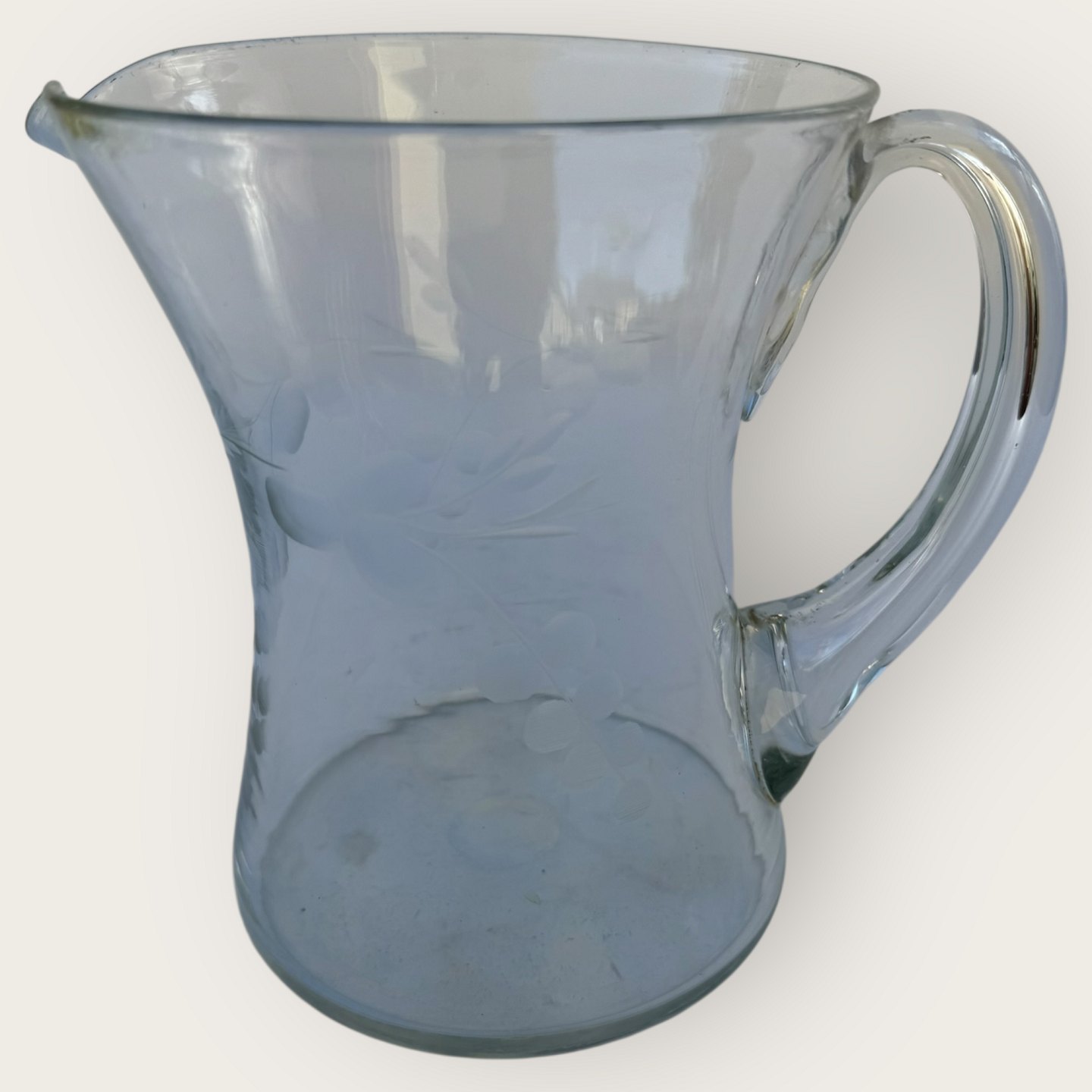 Beskrivelse: Bred glaskande med fine slibninger, Mål: HxBxD 17x19x13 cm, *Lidt kalk hvor hanken sidder fast på kanden(se foto) ellers pæn stand.