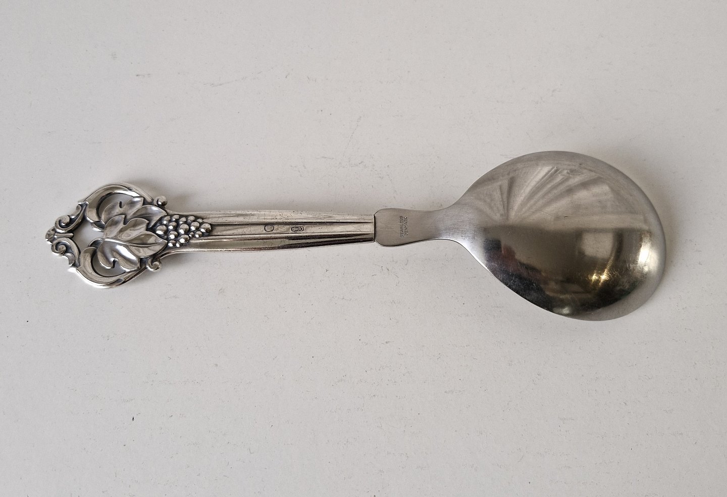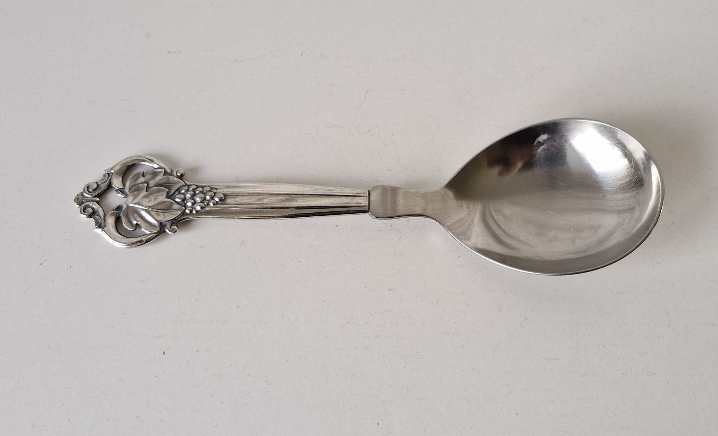 Beskrivelse: Serveringsske i sølv og stål dekoreret med drueklase