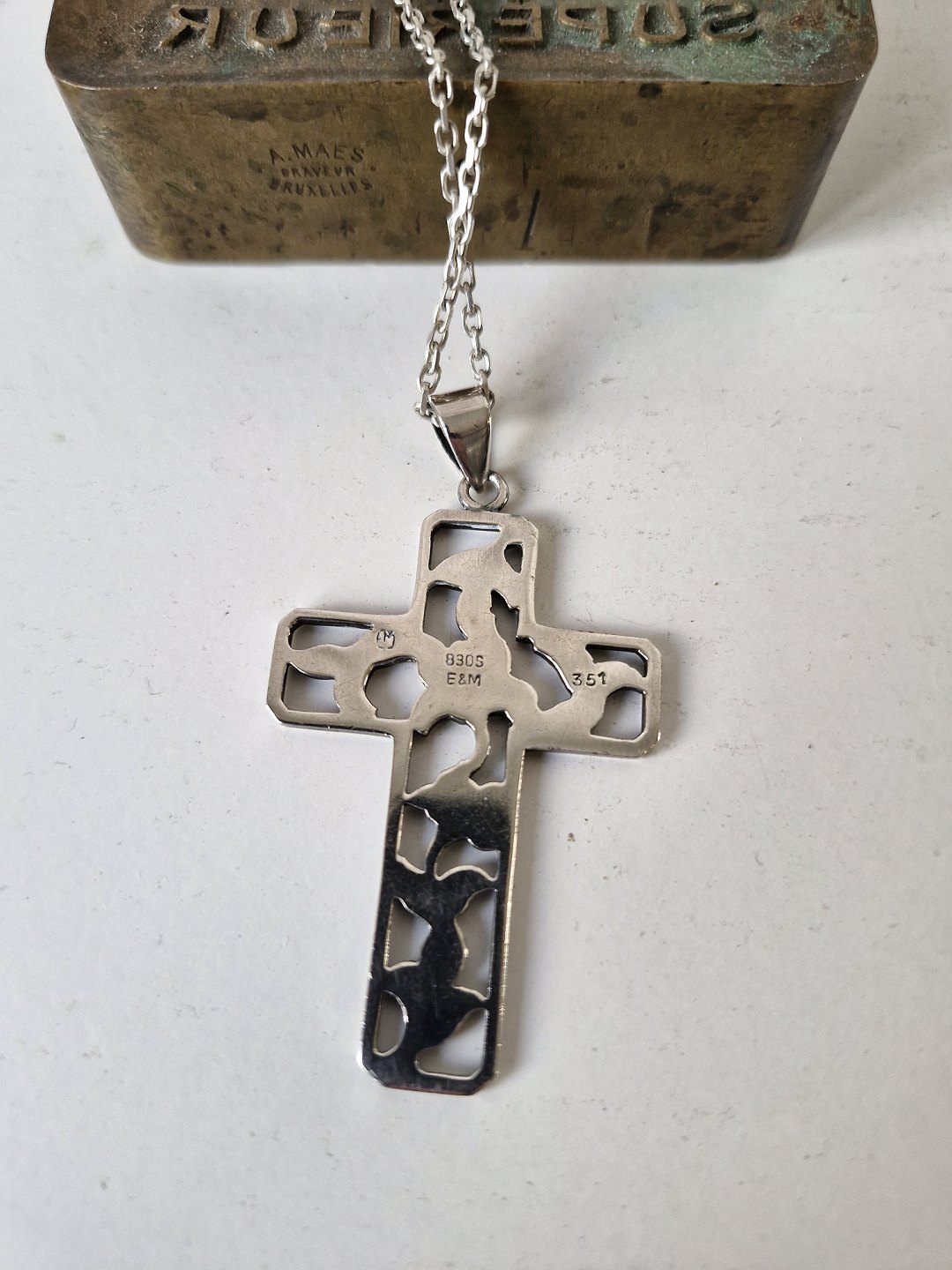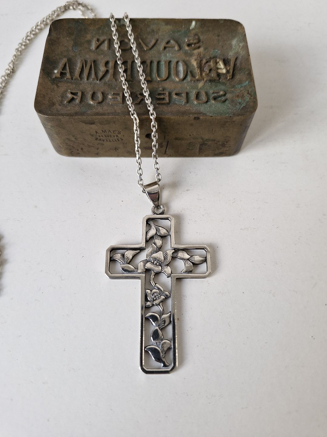 Description: Silver necklace with large silver cross. The cross is decorated with flowers and designed by Eiler & Marløe.