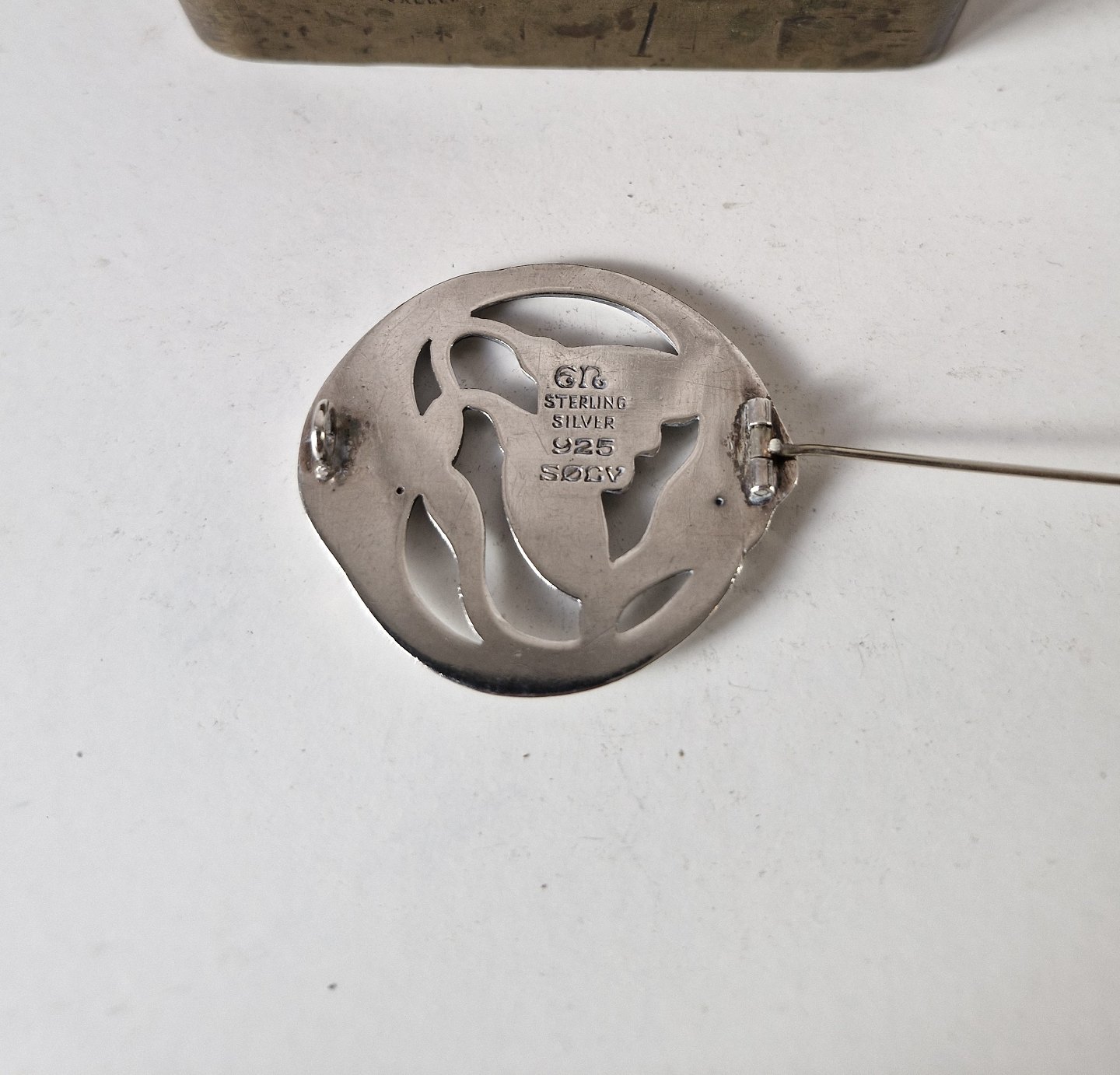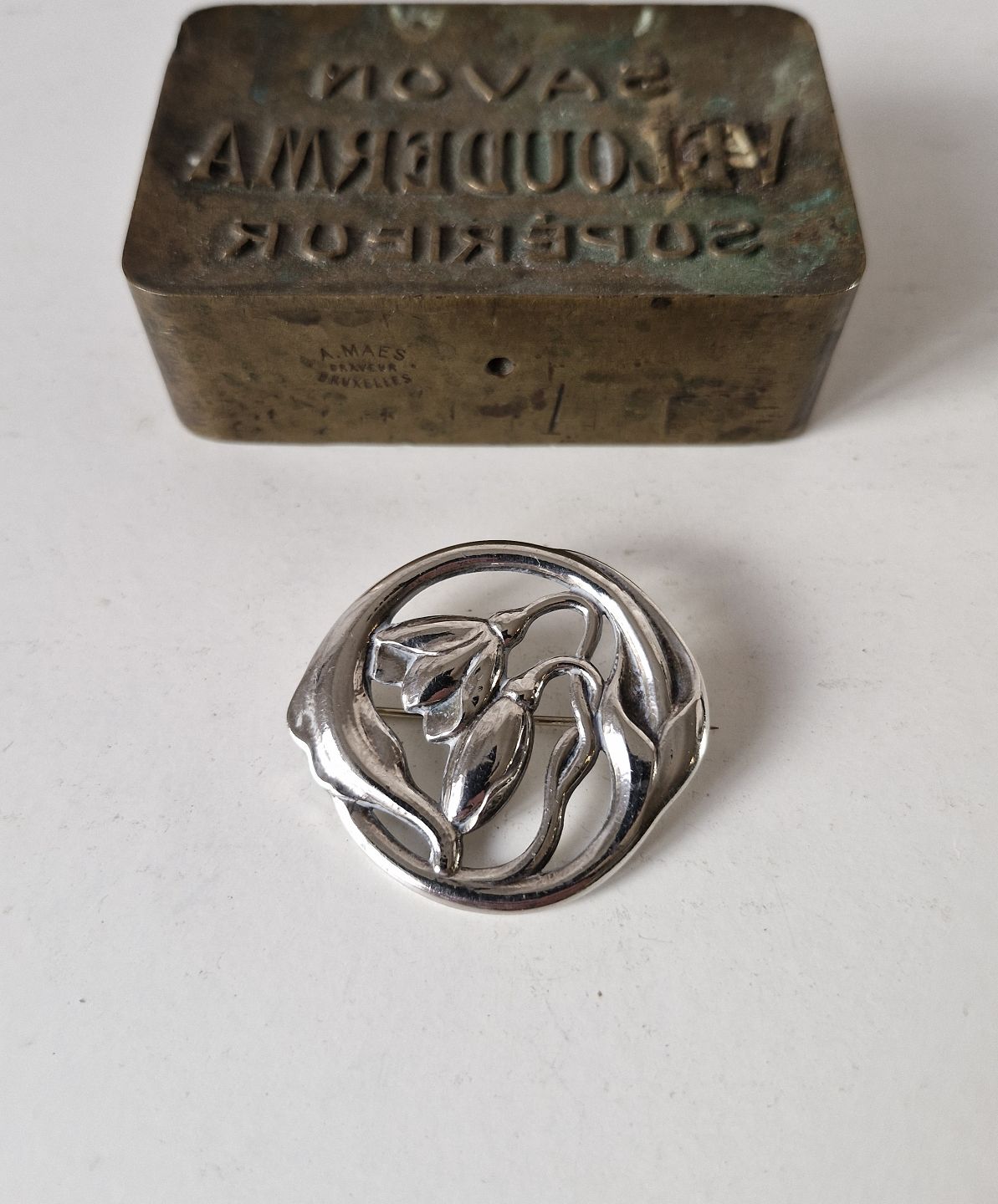 Beskrivelse: Evald Nielsen skønvirke broche i sølv dekoreret med vintergækker