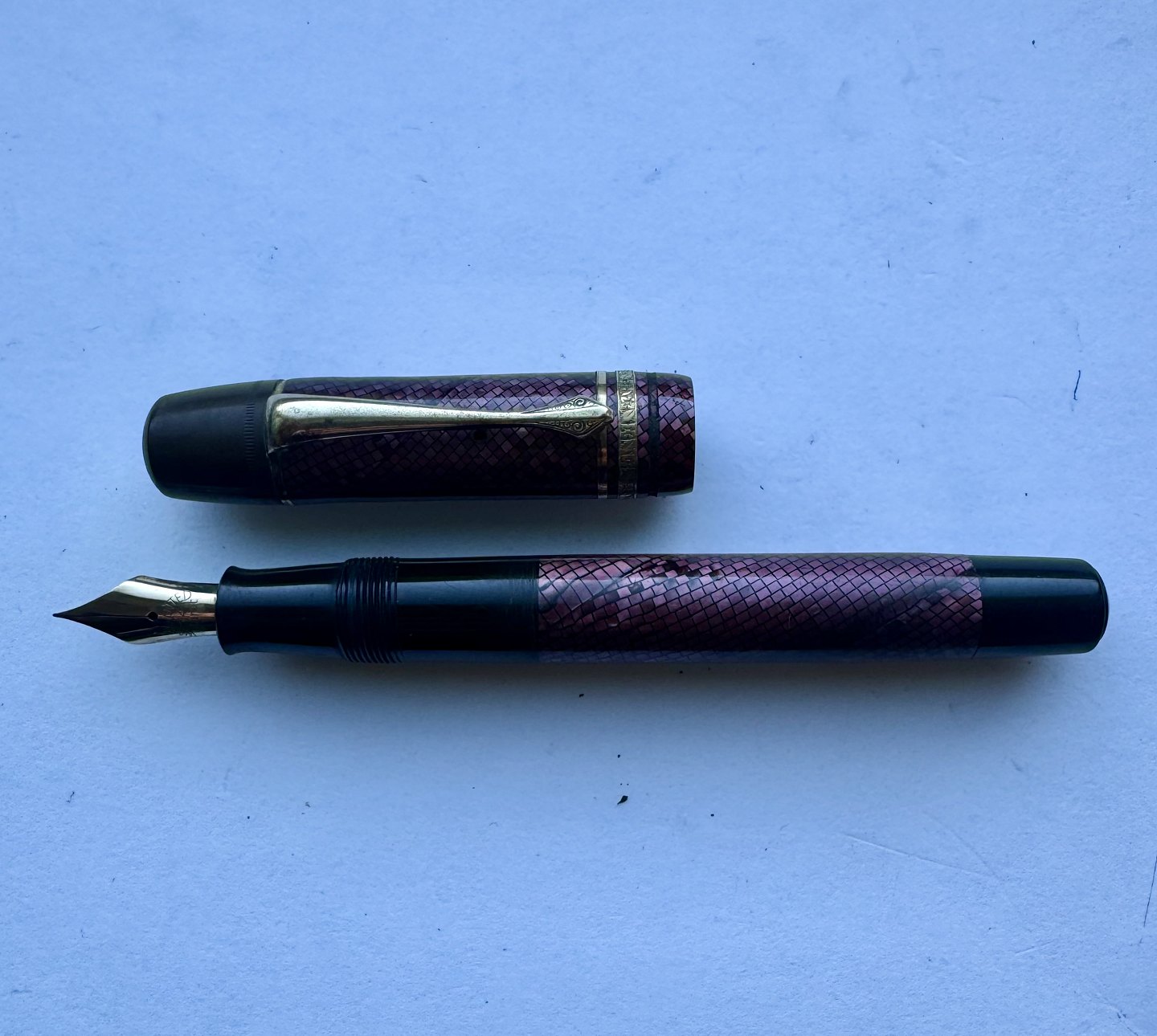 Beskrivelse: ART DECO STIL: Bordeaux slangeskind fyldepen fra omkring 1940. Fremstår i god stand uden skader eller reparationer. “Push button” blæk-påfylder. Fungerer ikke. Der skal isættes ny gummisæk før end den er funktionsdygtig igen. Ny gummisæk isættes mod en betaling på kr. 250,- Denne fyldepen er 12,5 cm lang.