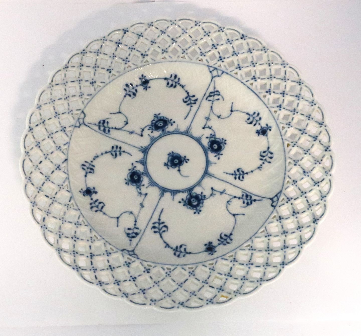 Description: Royal Copenhagen. Blue Fluted Full Lace. Flat plate with open-work border. Model 1098. Diameter 25,5 cm. (4 quality).