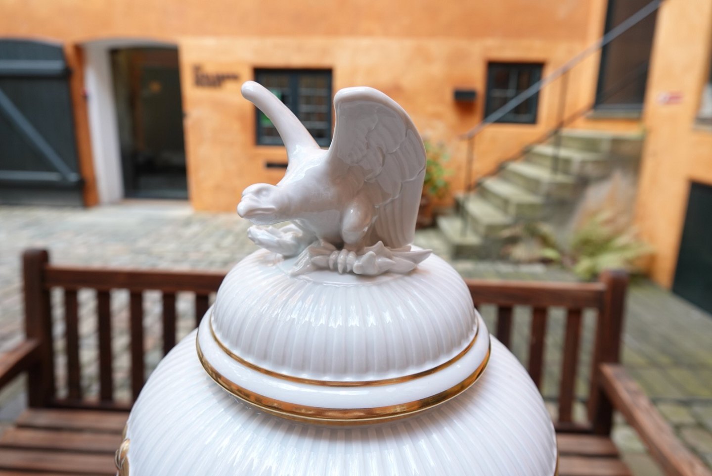 Description: Royal Copenhagen, enormous lidded jar with eagle on top. It is decorated with multicolored flowers as Sachian Flower.