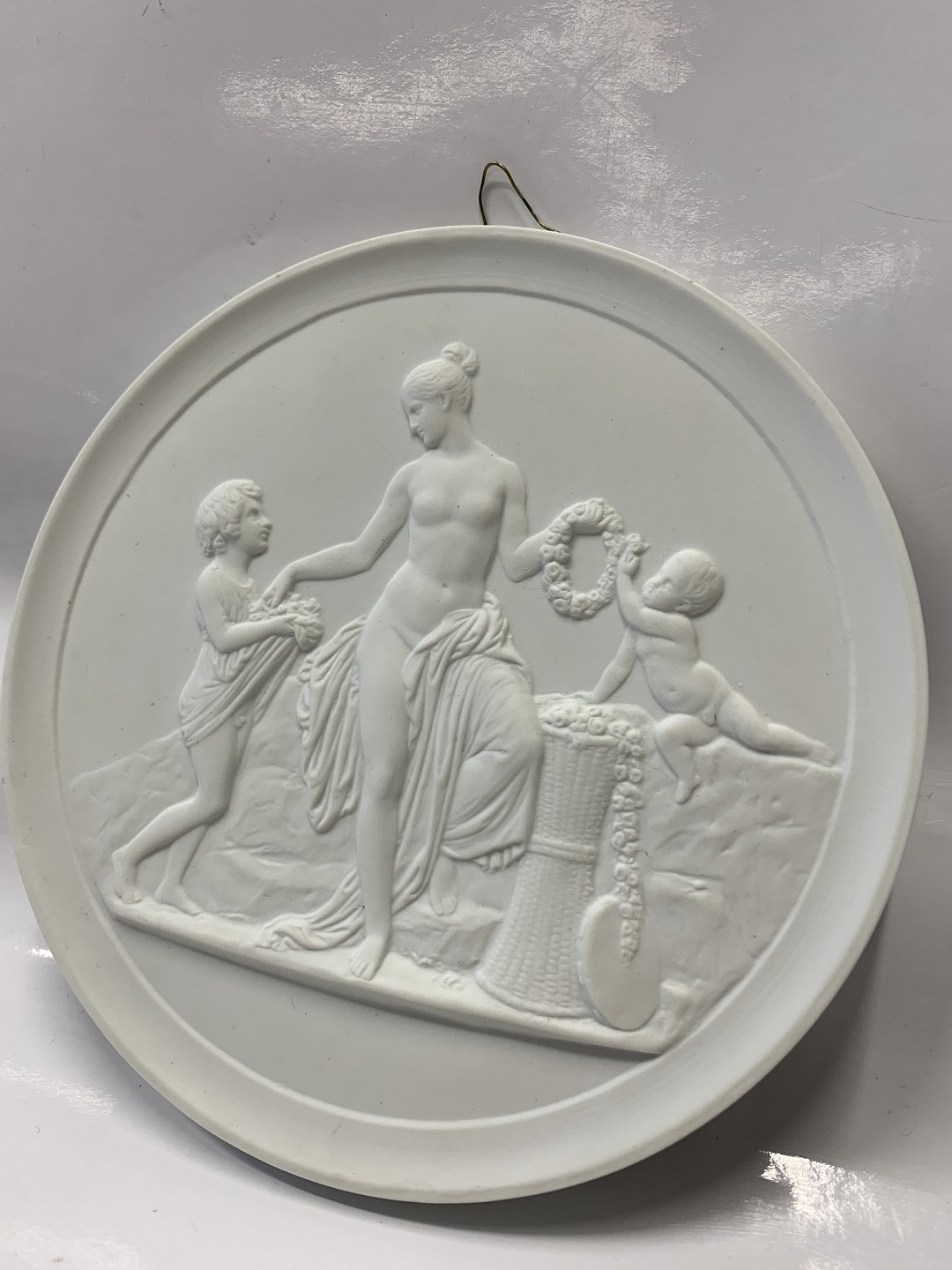 Beskrivelse: Royal Copenhagen Bisquit platte af Thorvaldsen "Barndom og Forår."
