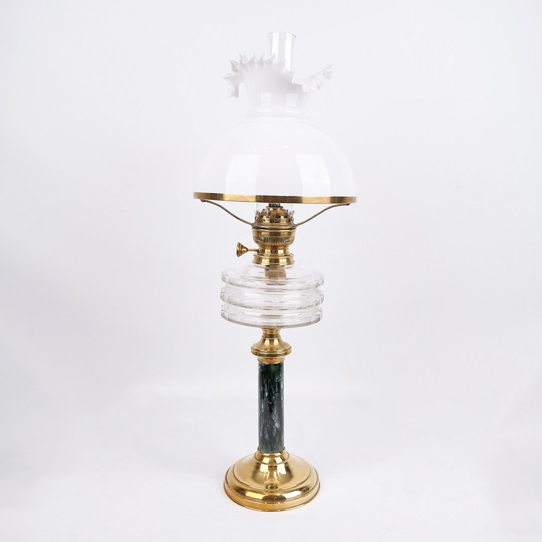 Petroleumslampe – Messing & Hvidt Opalglas – Fynsk Glasværk – År 1880’erne