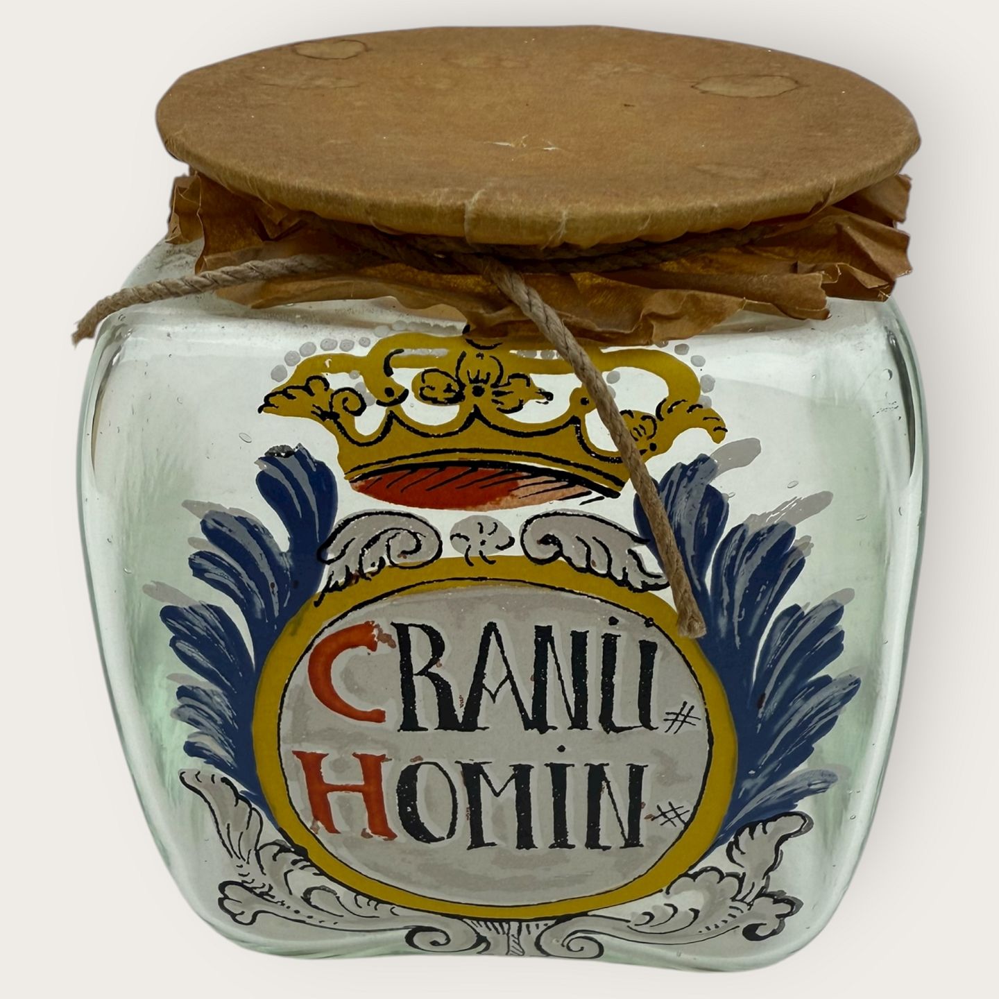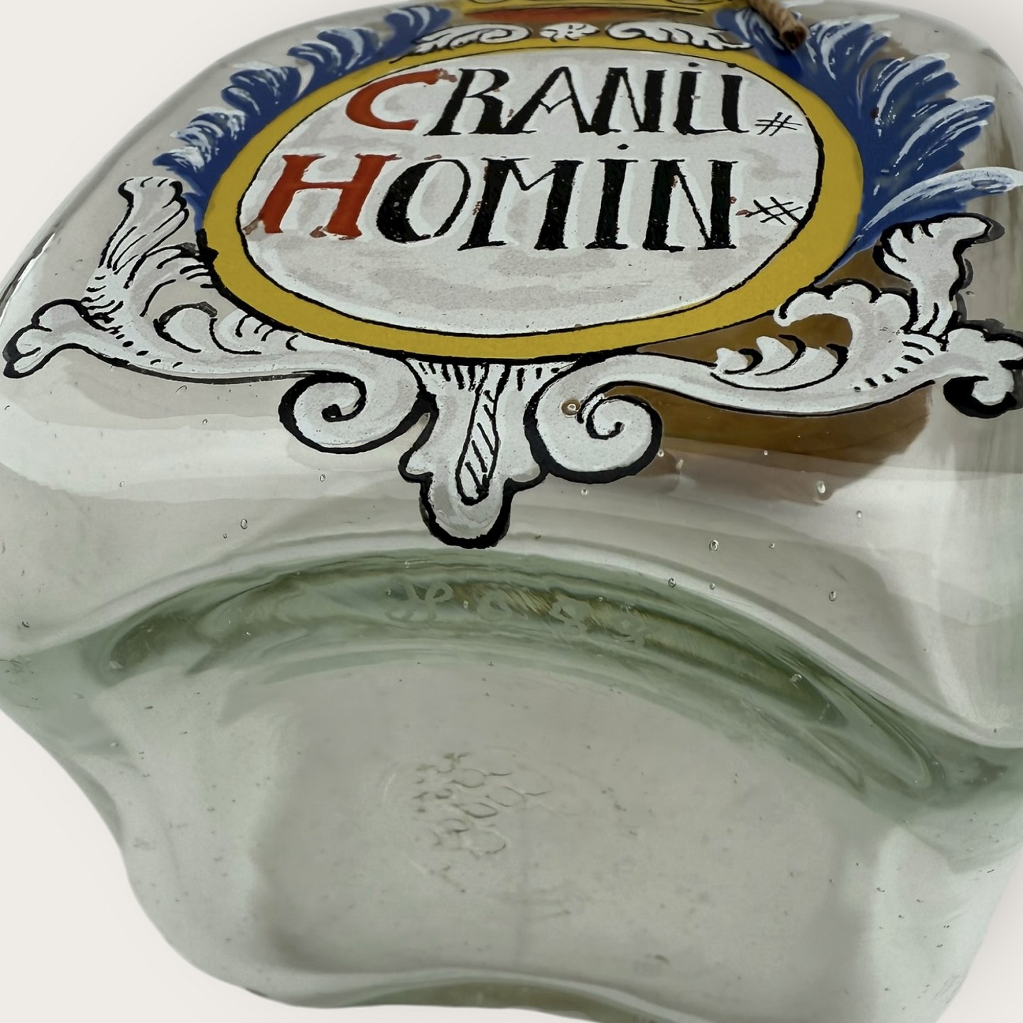 Beskrivelse: Holmegaard apotekerflaske fra 1988, Cranu Homin, Mål: 10x8,5x8,5cm, flaskerne er mundblæste kopier af originale gamle apotekerflasker, Signeret Hg88.