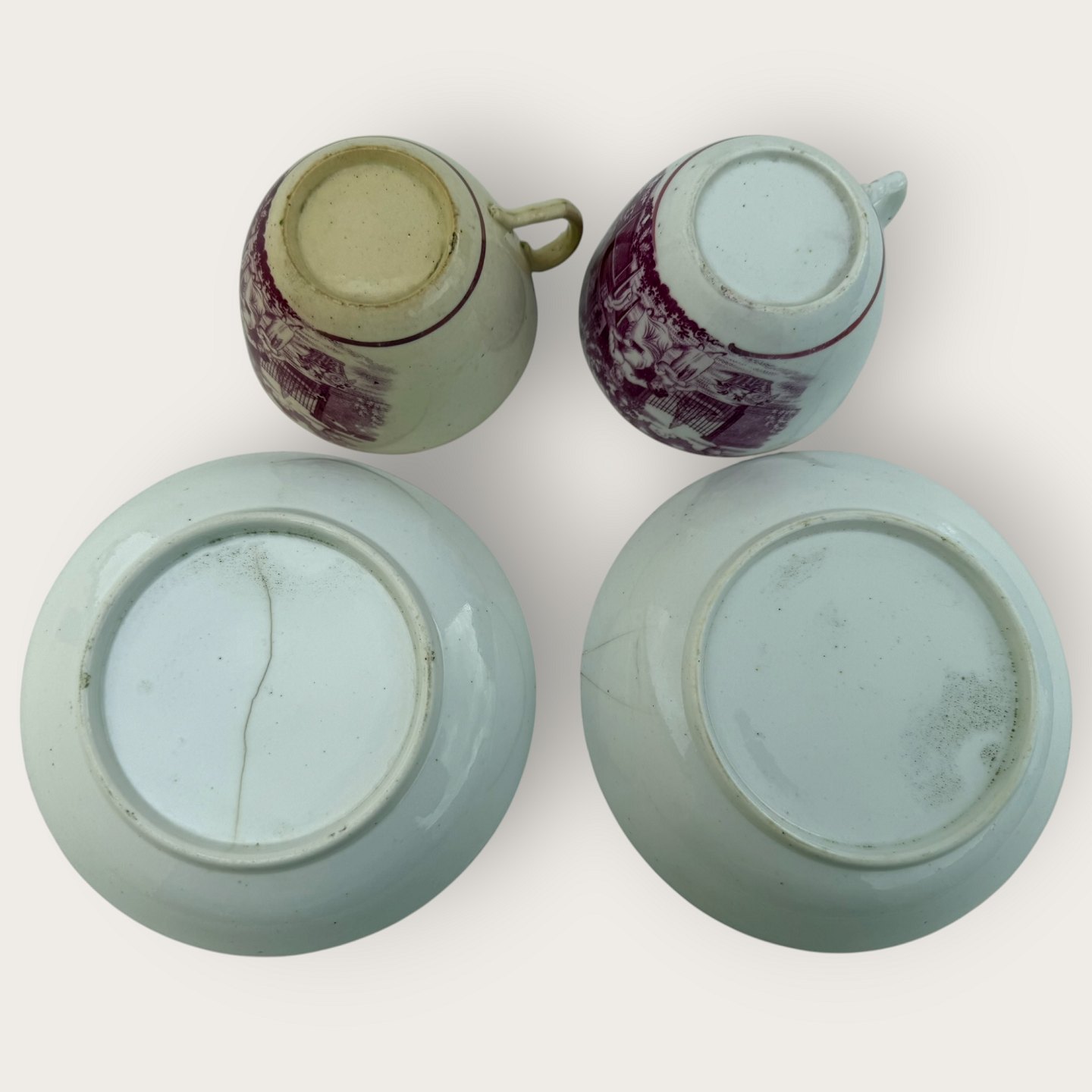 Description: 2 antique English porcelain cups with saucers, Staffordshire cups with a motif of mother and child, appear with scratches/age-related minor flaws - see photo.