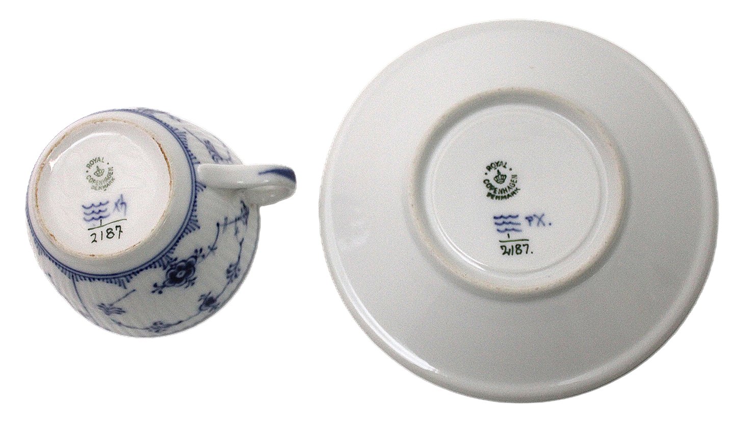 Beskrivelse: Royal Copenhagen, Musselmalet Riflet. Hotelporcelæn, Jernporcelæn. Robust og kraftigt stel. Stor kaffekop med underkop. Nr. 1/2187. Højde 6 cm. Øverste diameter 9 cm. Underkop diameter 15,5 cm. I. sortering. Pris: SOLGT
