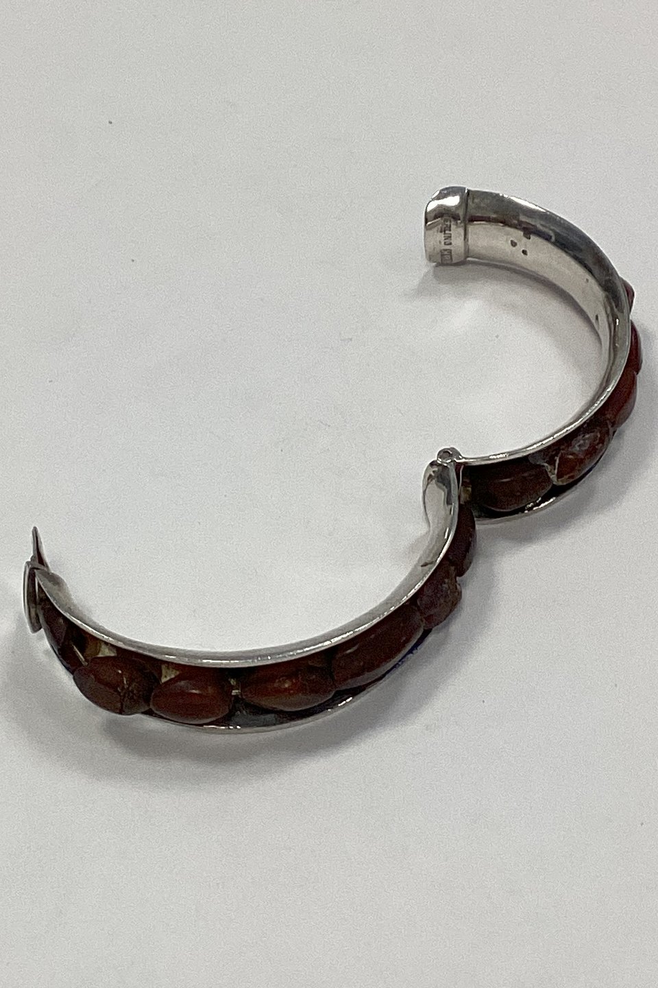 Beskrivelse: Armbånd i Sterling Sølv pyntet med rav, af Niels Østergaard Knudsen