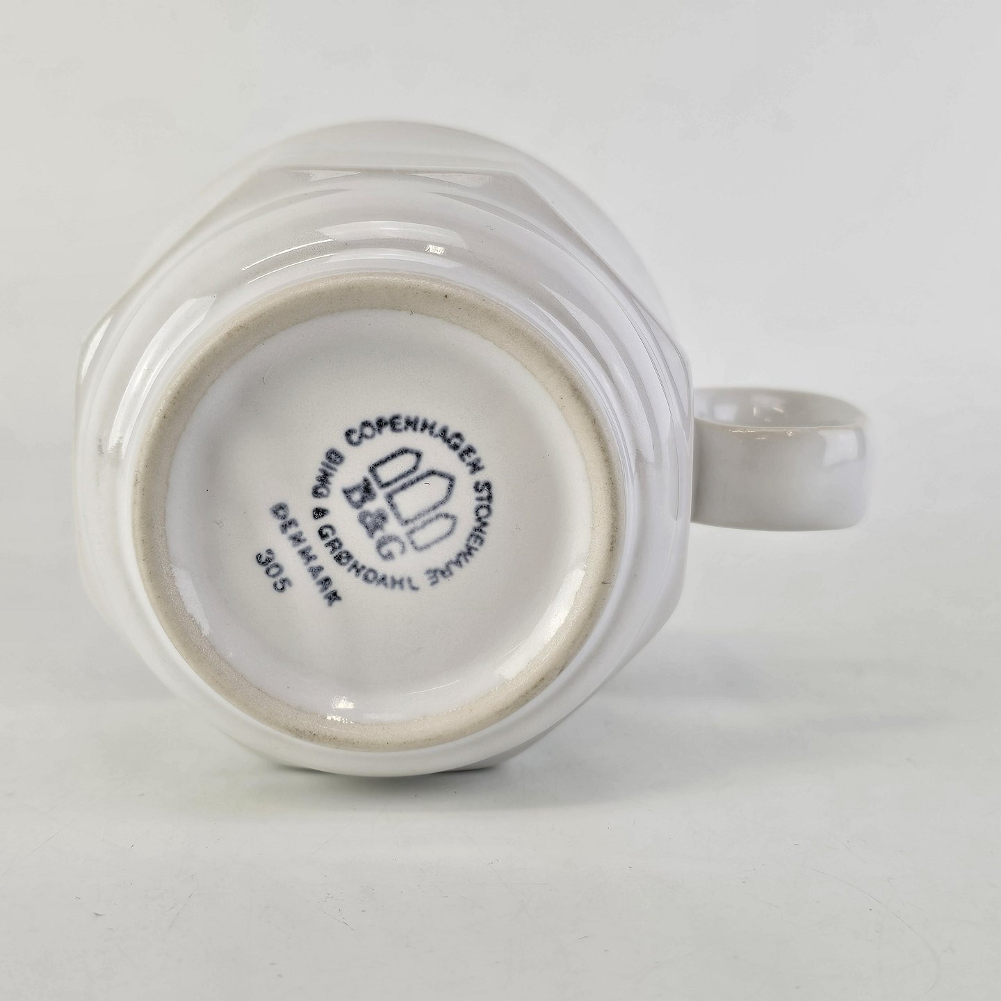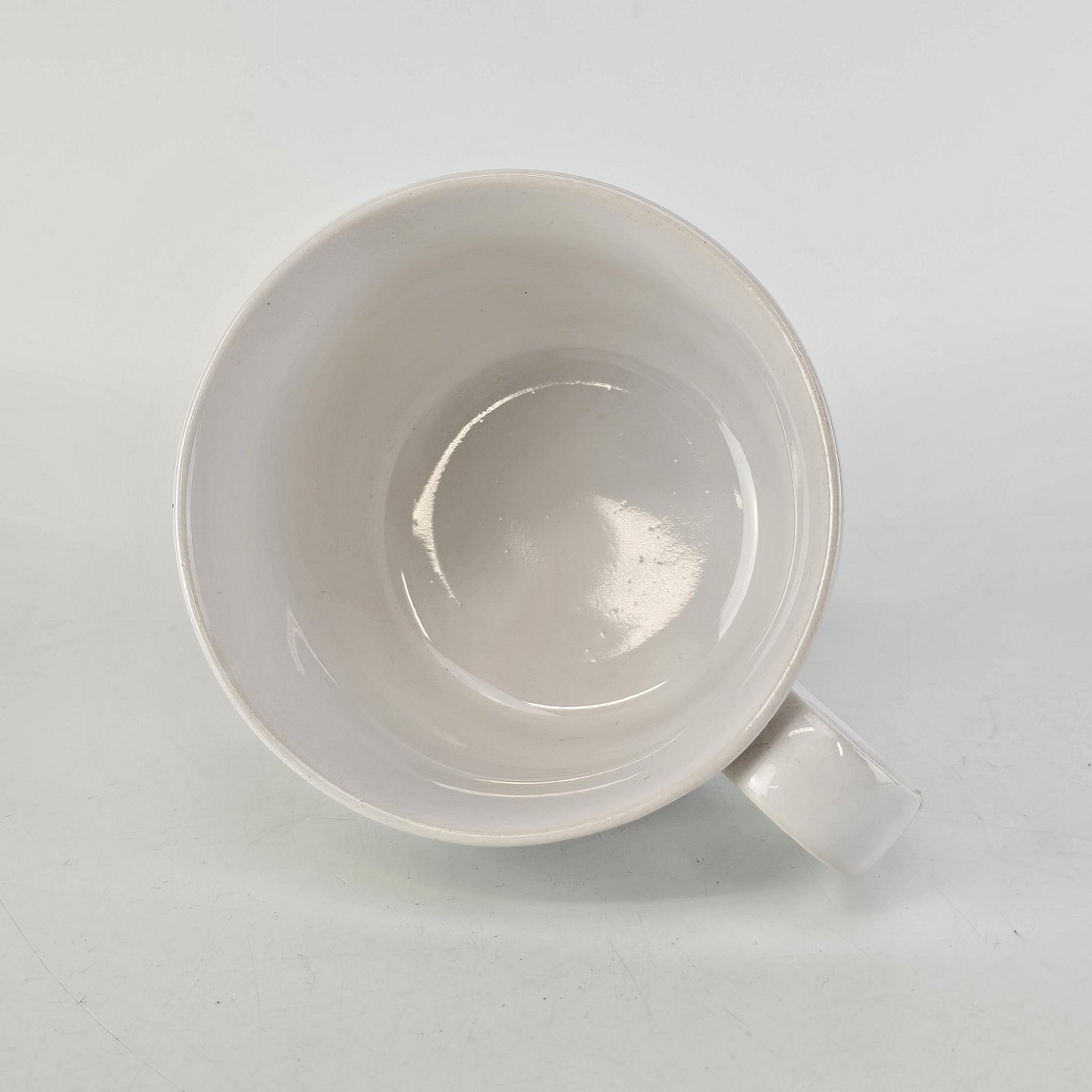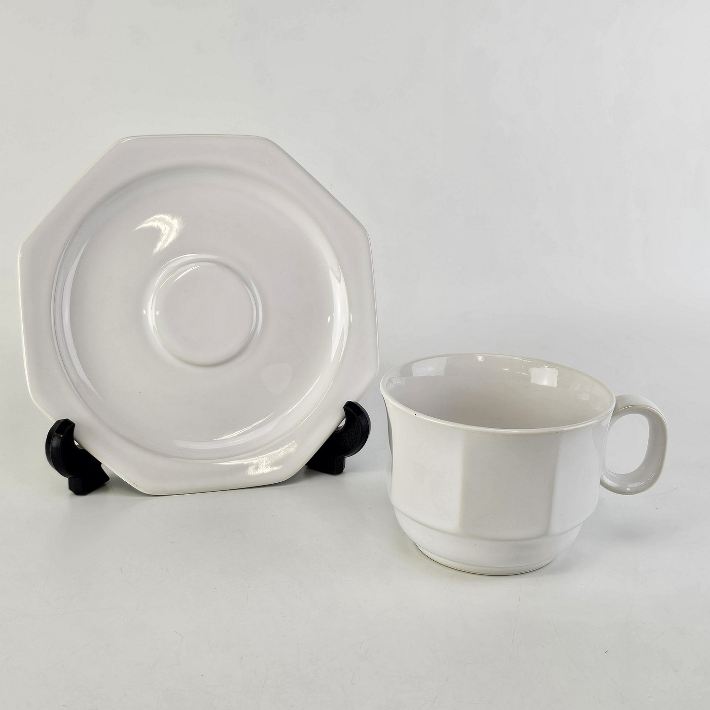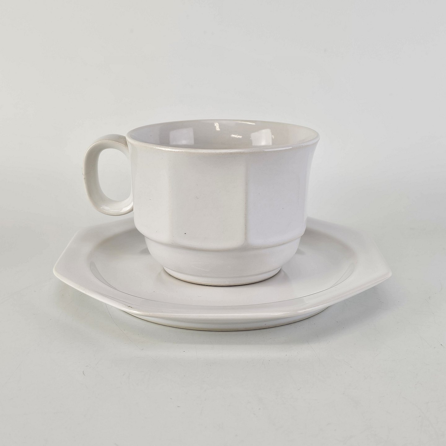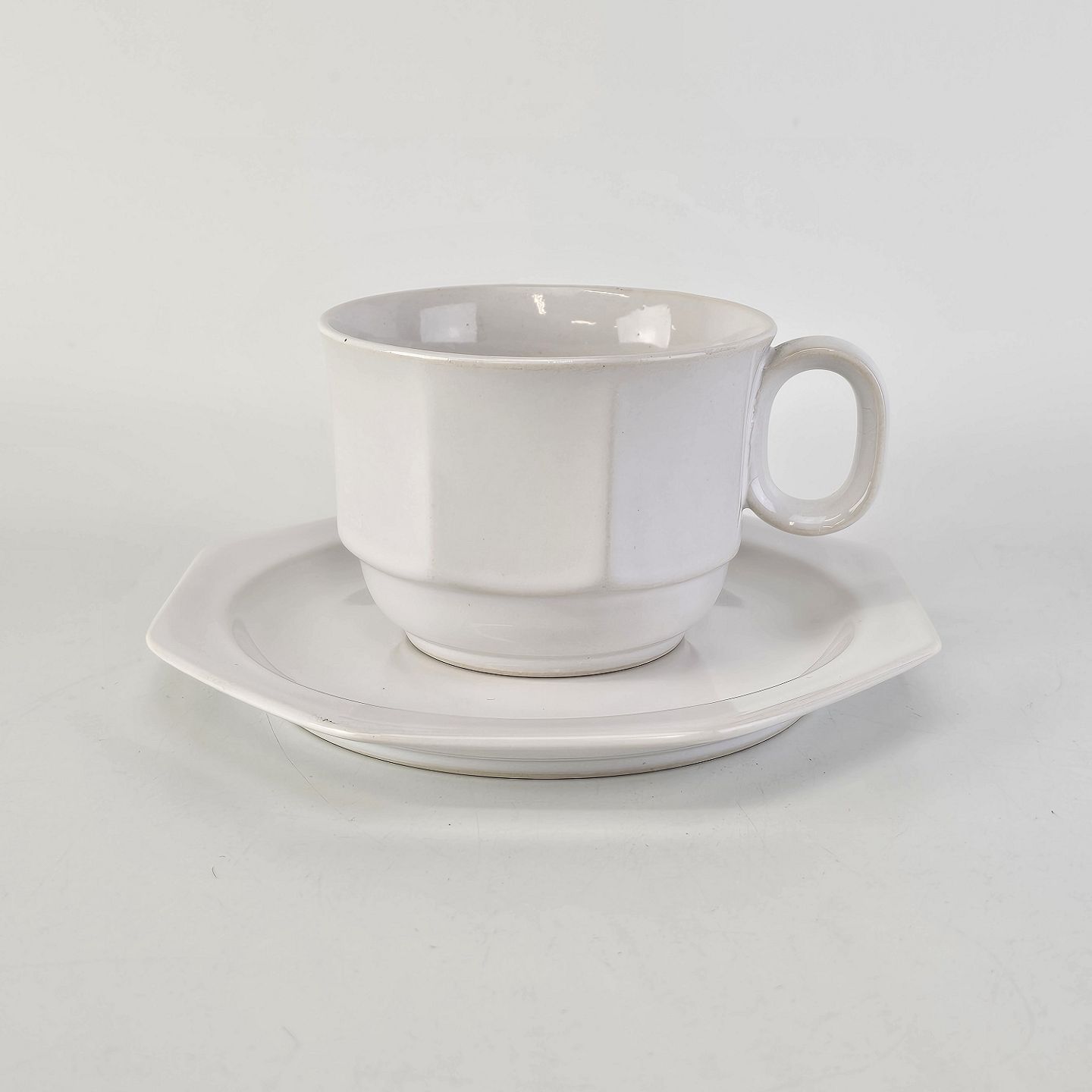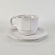 Beskrivelse: Kop og underkop i hvid stentøj fra stellet Café