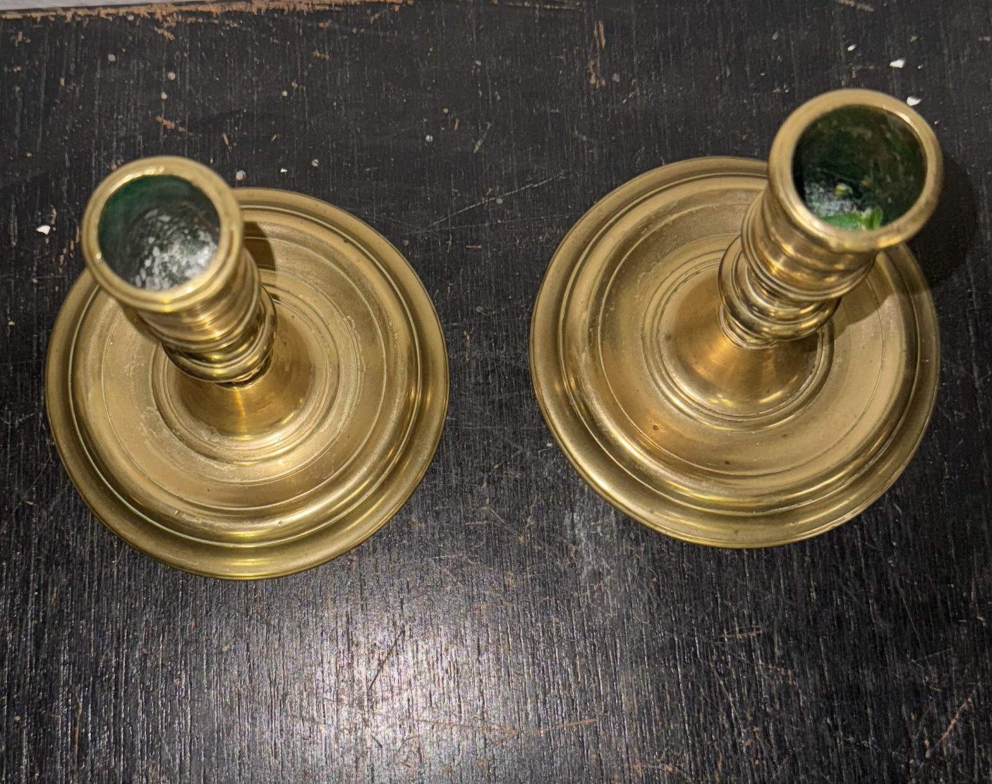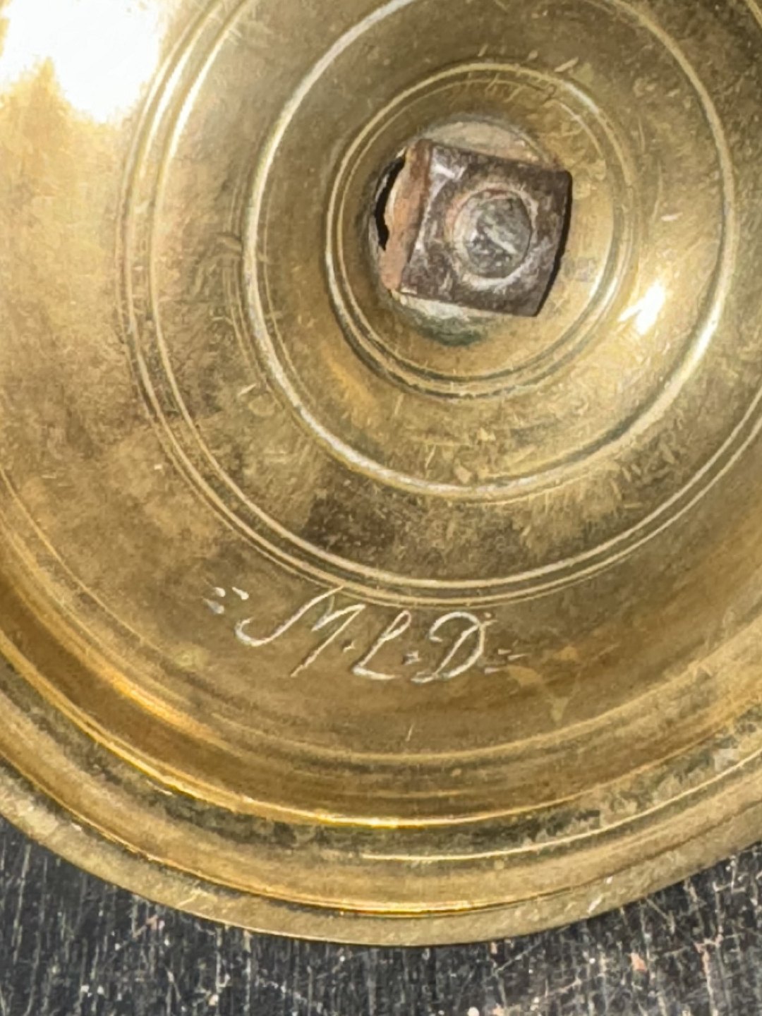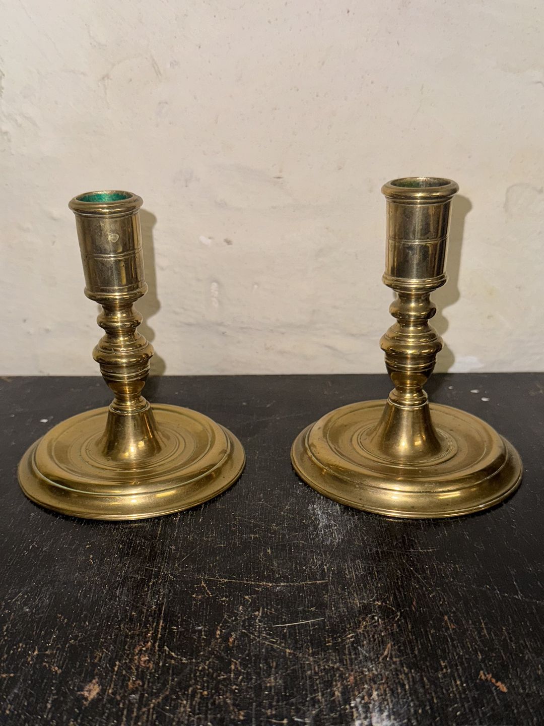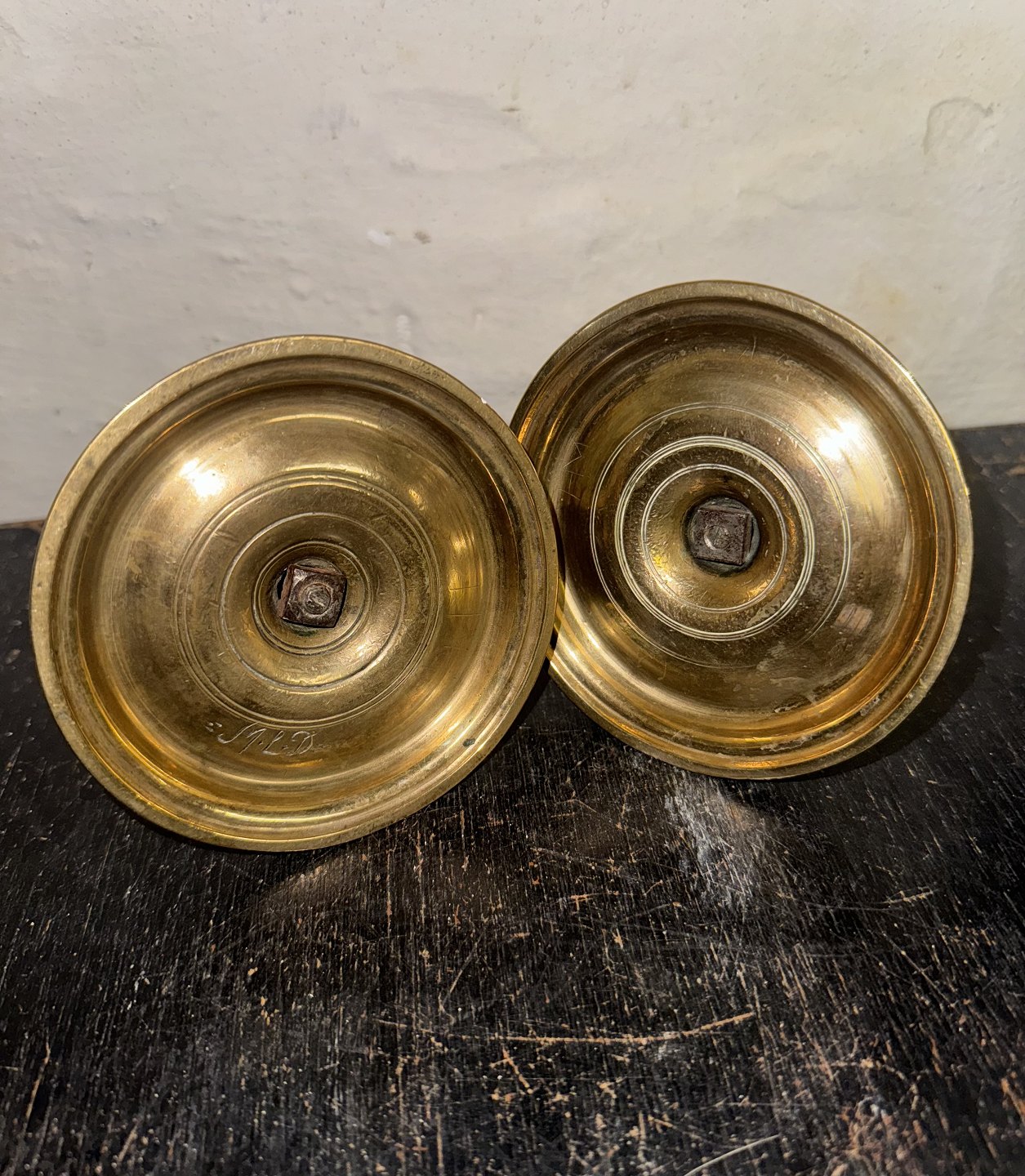 Description: Pair of low brass candlesticks from the second half of the 18th century. In perfect condition. One engraved on the base with the initials MLD. Measurements: H. 12.5 cm, the diameter of the base is 10.5 cm.