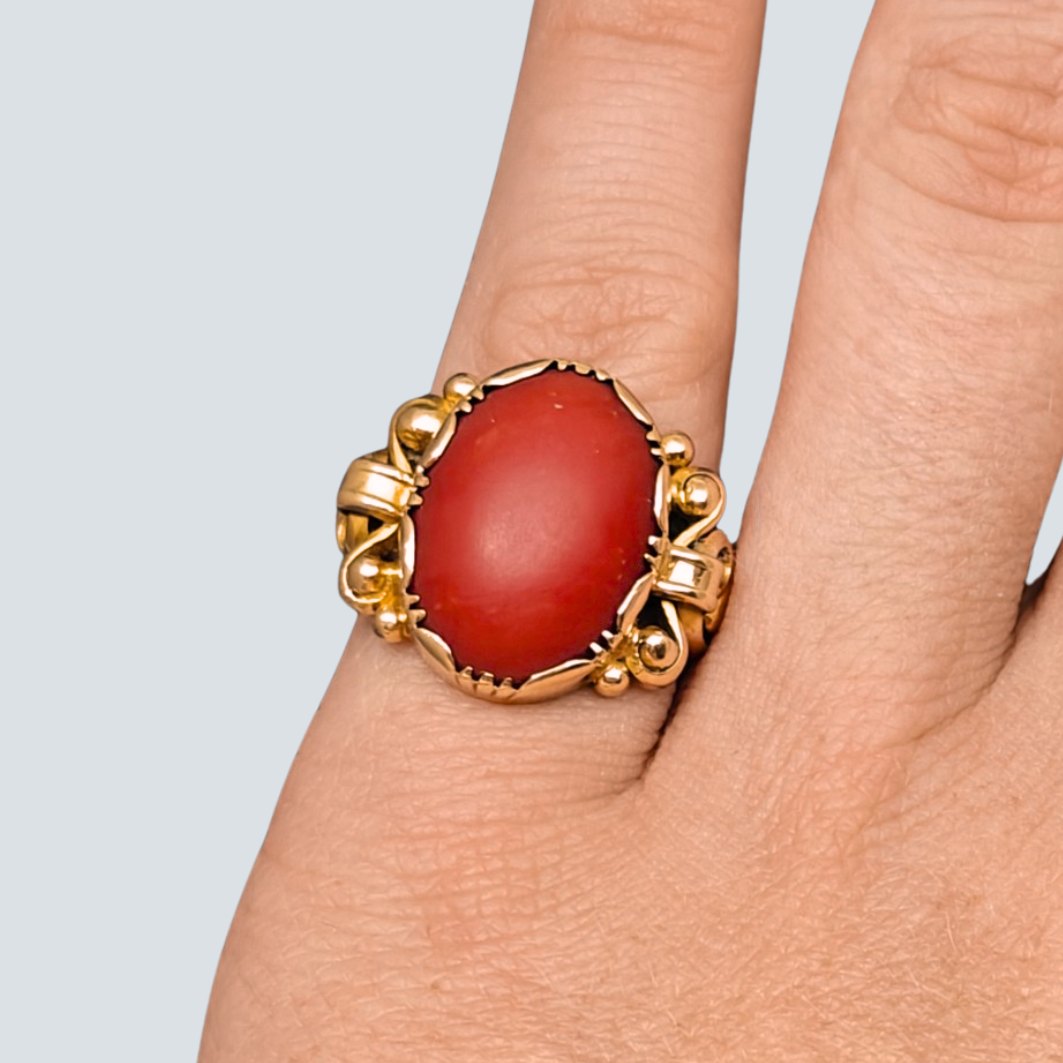 Beskrivelse: Ring i 14 guld med oval koral. Ringen er fra omkring 1920.