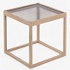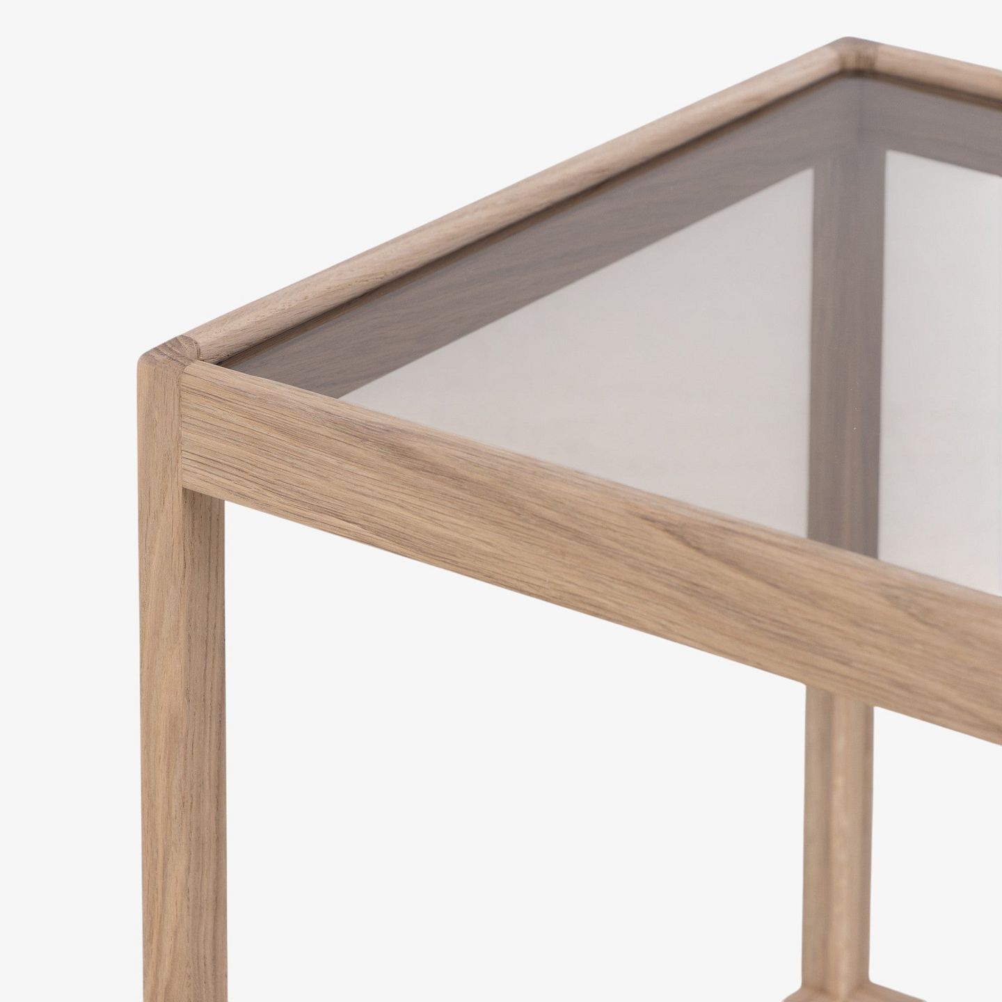 'Kubebord' med stel i lyst egetræ og røgfarvet glasplade.