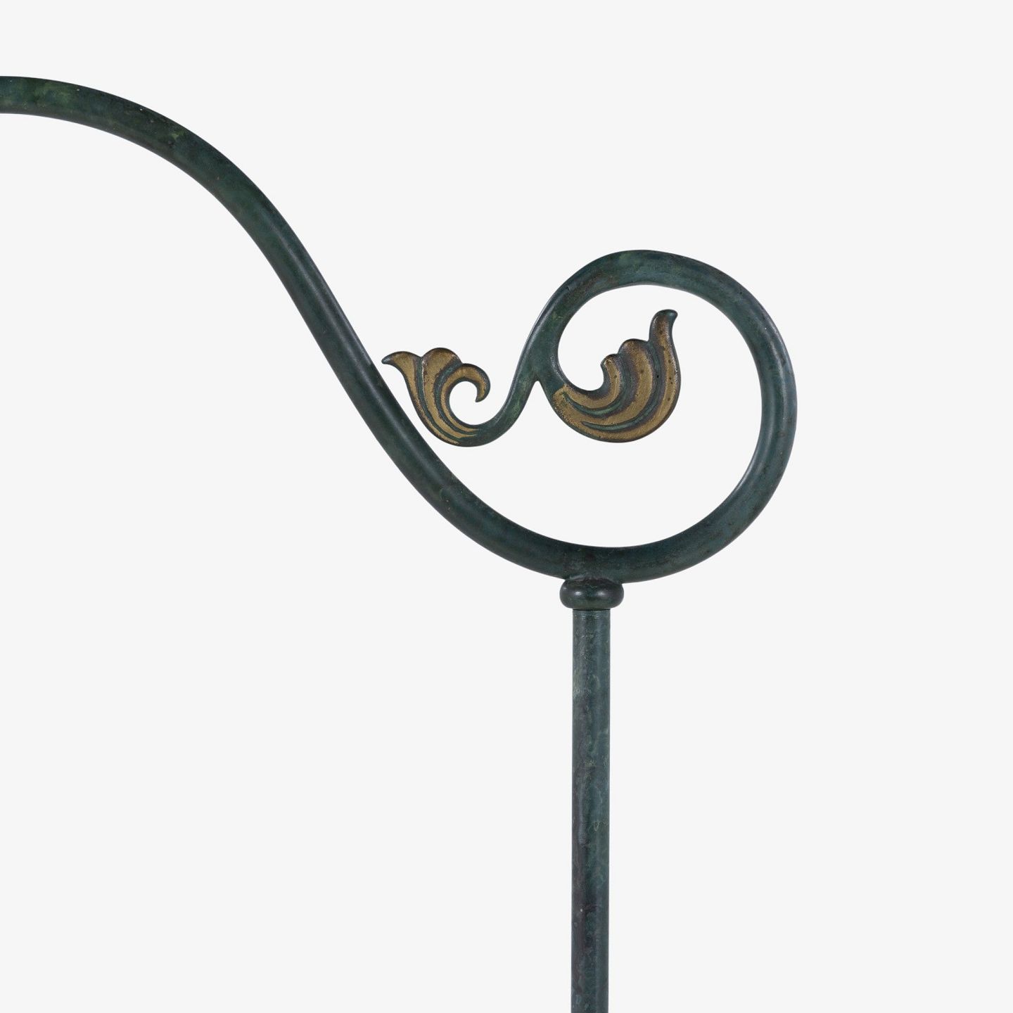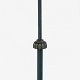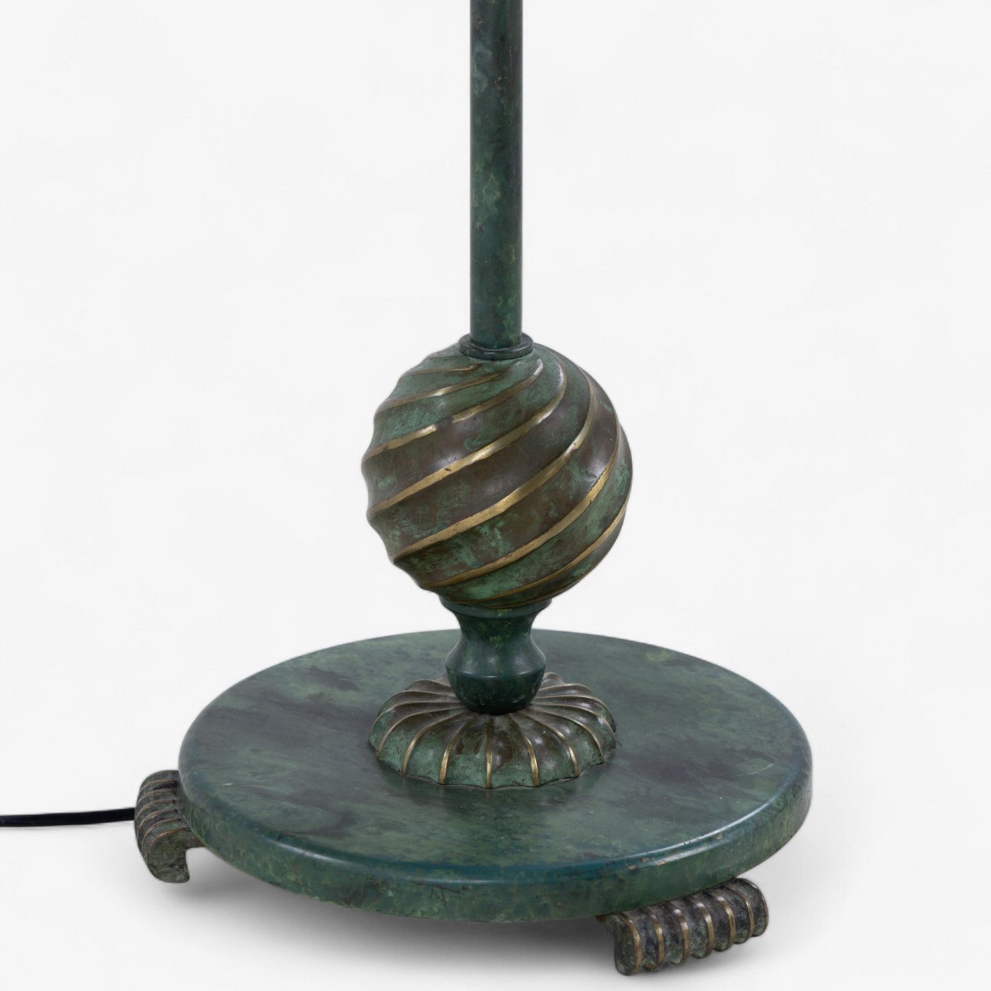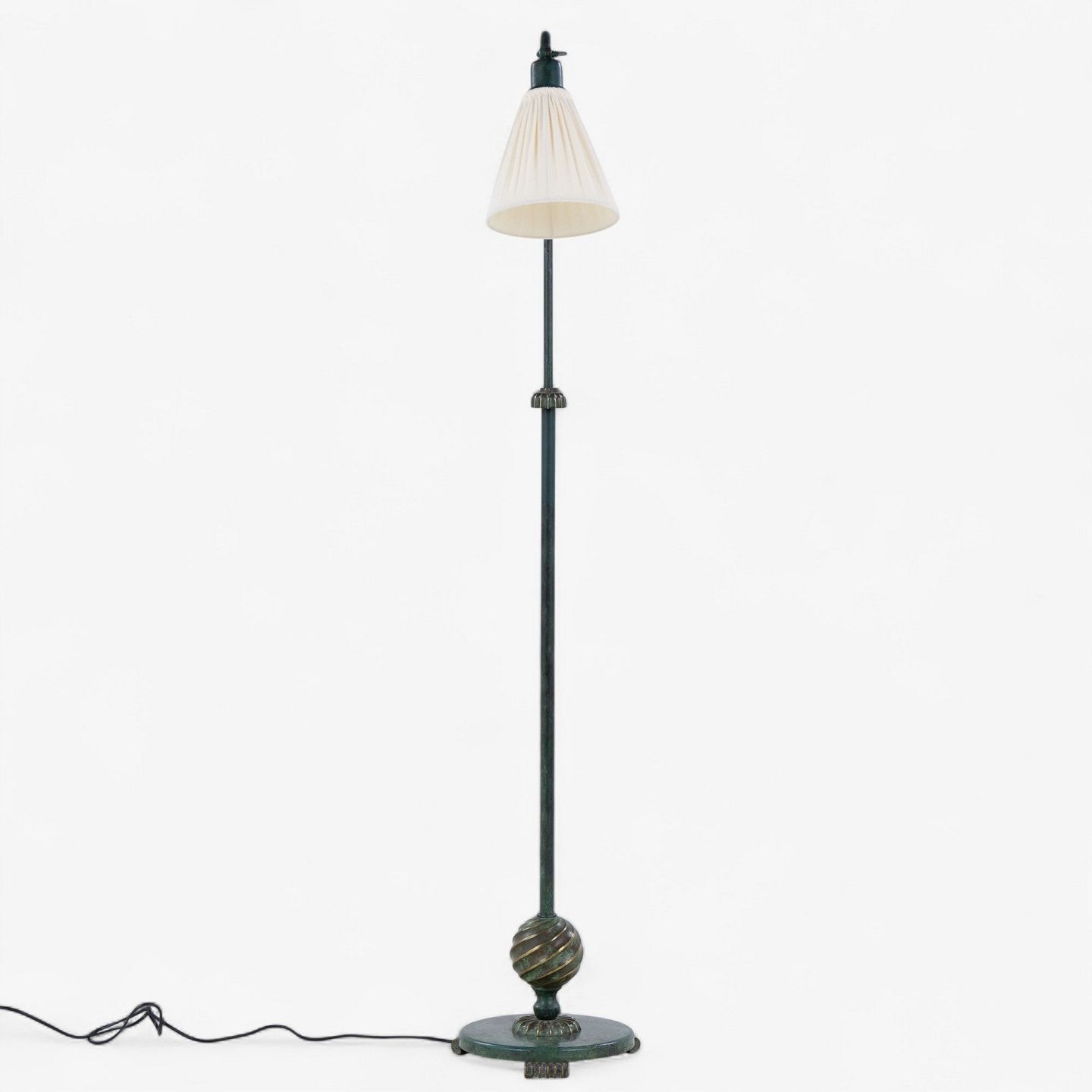 Skulpturel gulvlampe i patineret bronze med højdejustering og hvid stofskærm. Fra 1930.