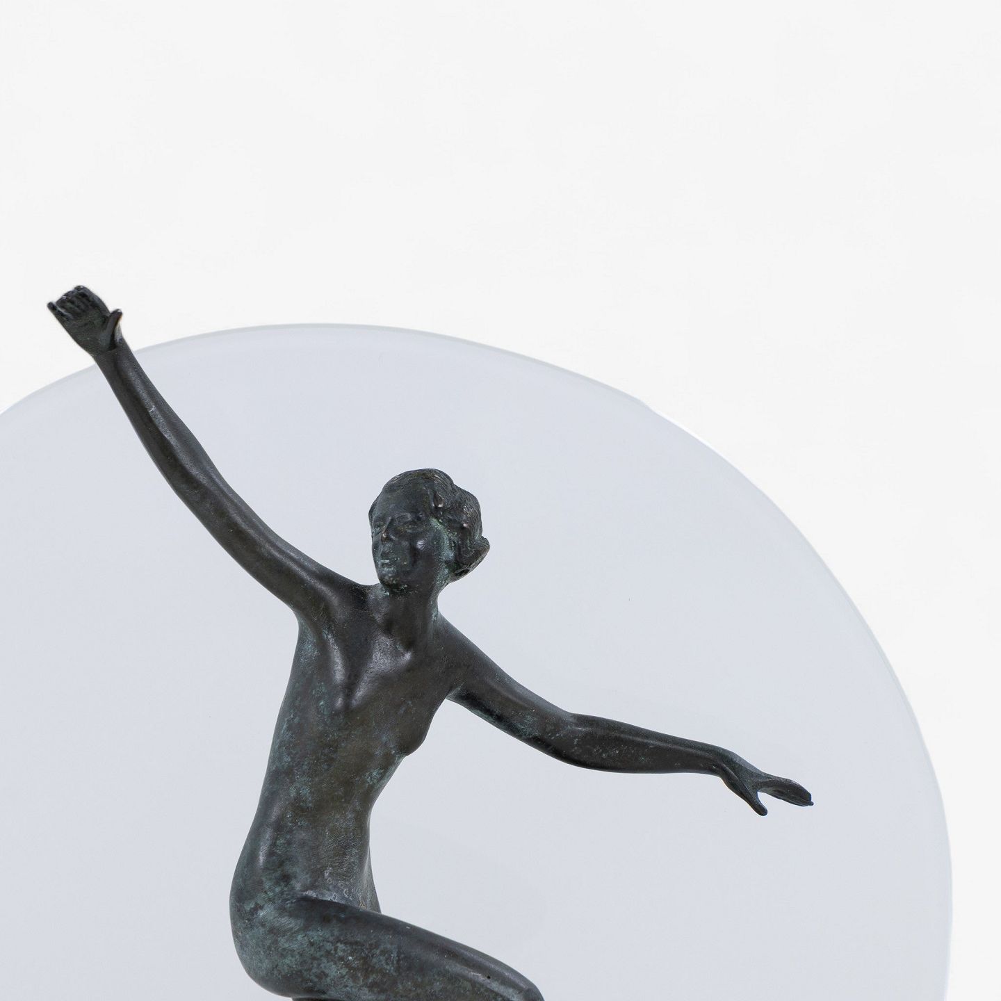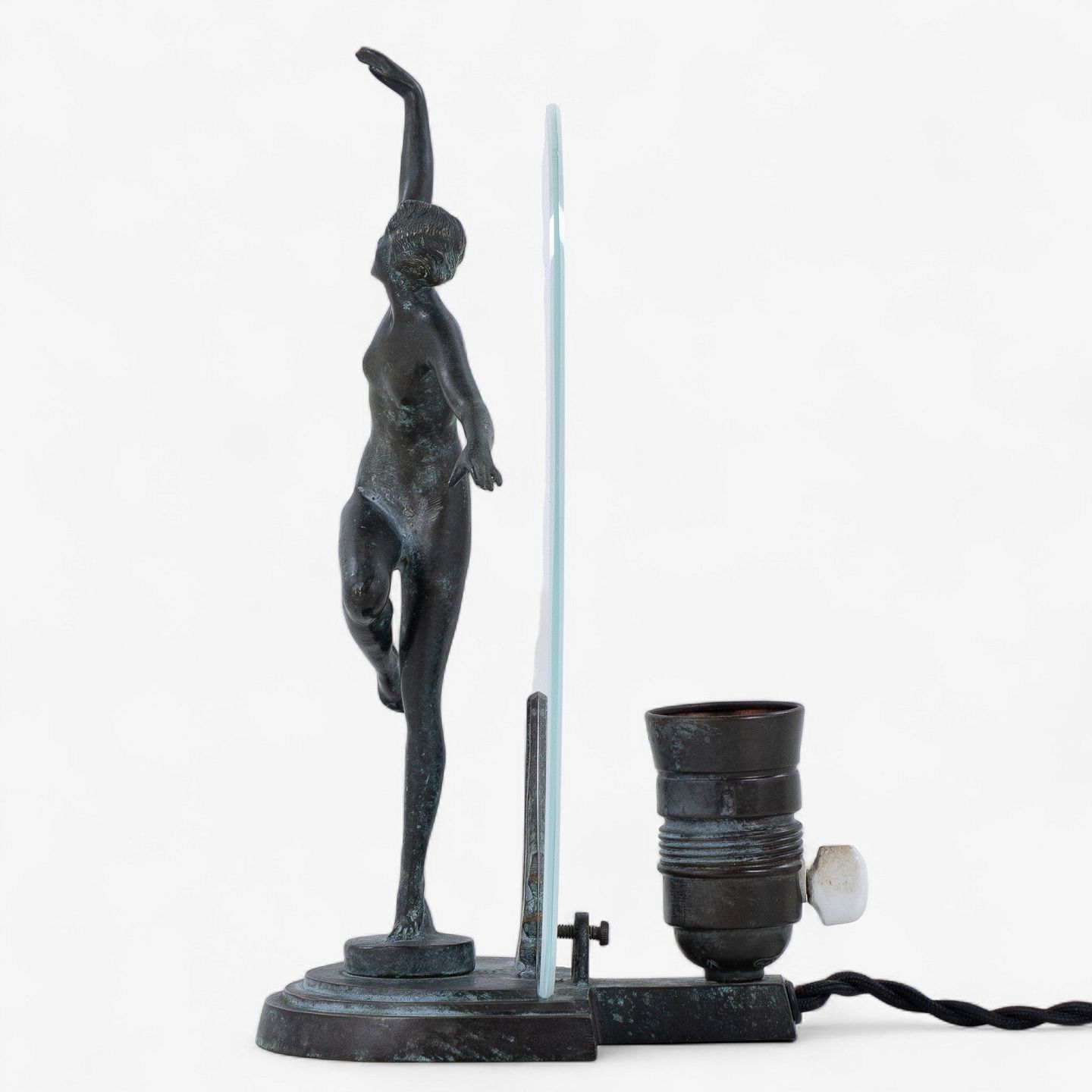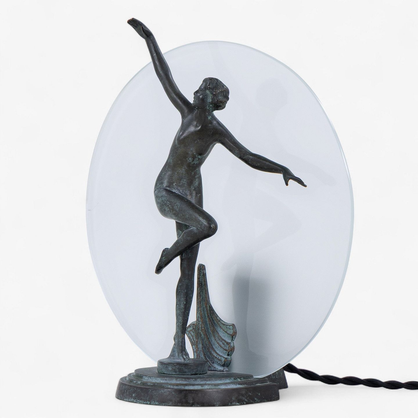 Bordlampe med dansende kvinde i patineret bronze og glasskærm.
