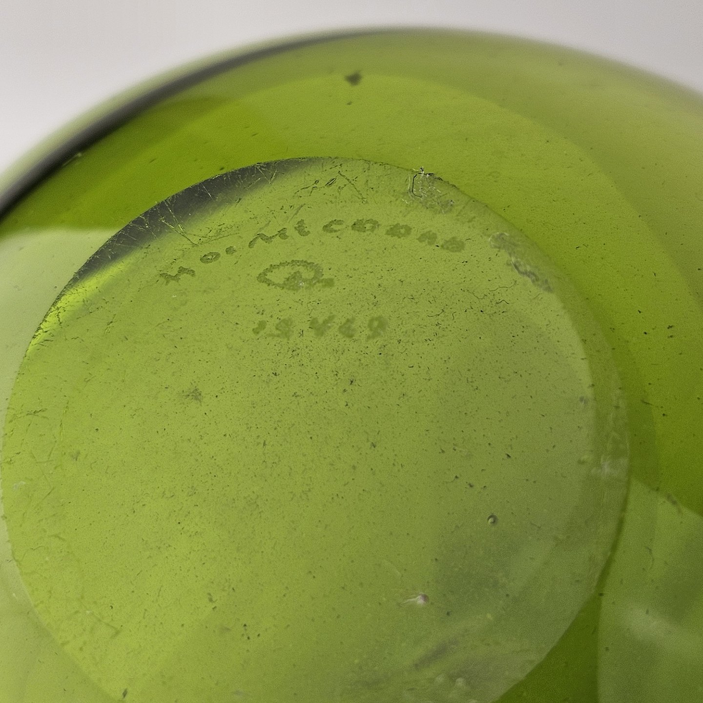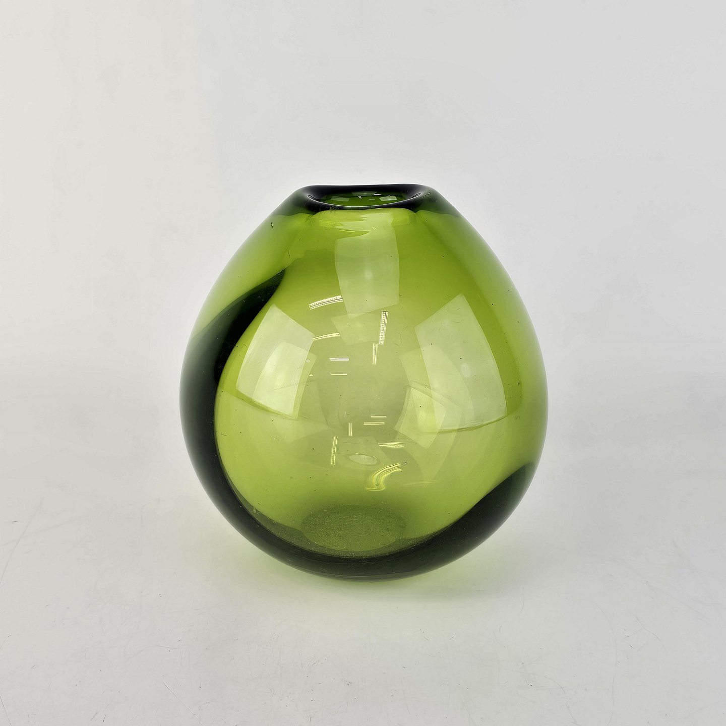 Beskrivelse: Dråbeformet vase i majgrøn glas