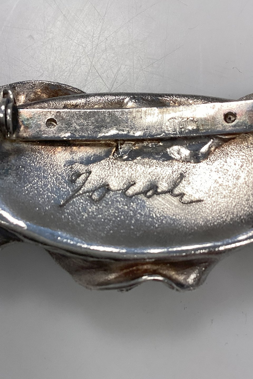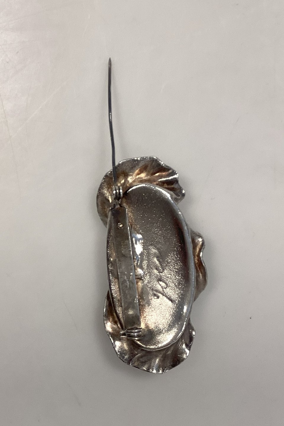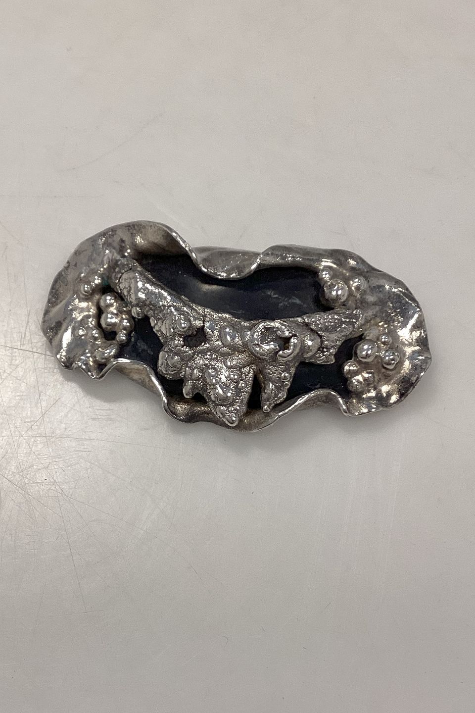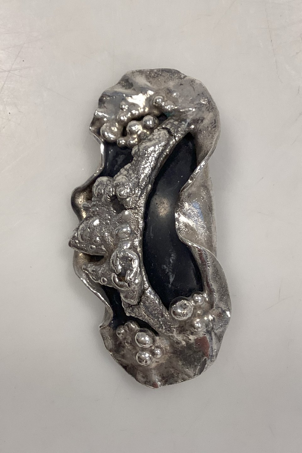 Ornamenteret Jacob Hull Broche i Forsølvet metal med sort sten