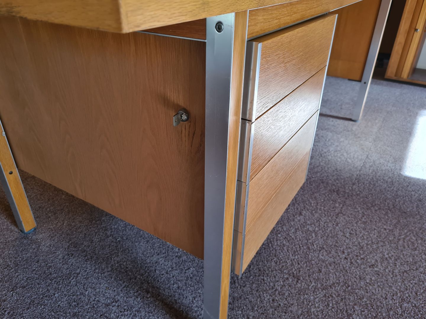 Beskrivelse: Stort Skrivebord fra 1980'erne i eg og aluminium. Fremstår pænt, velholdt og udmærket funktionsdygtigt. Dog med meget let afblegning på bordpladen efter en skrivemåtte. (Ses på billede)