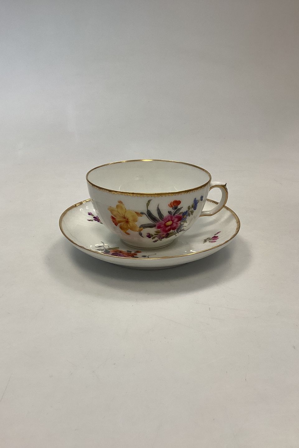 Description: Royal Copenhagen Full Saxon Flower Large Teacup No. 1550. In fine condition, but slight wear on the gold rim. Cup measures 11 cm x 6.5 cm / 4.52 in. x 2.55 in. Saucer measures 16.5 cm / 6.5 in.