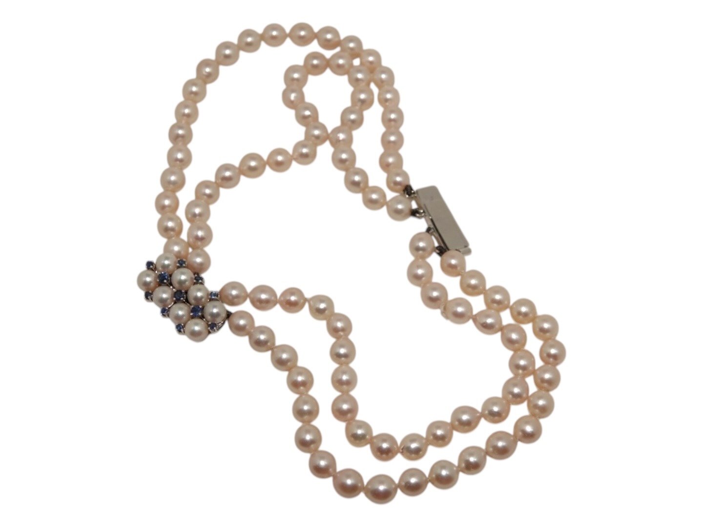 Dobbeltradet perle armbånd af store japanske rosa Akoja perler med 14 karat hvidgulds vedhæng med safirer