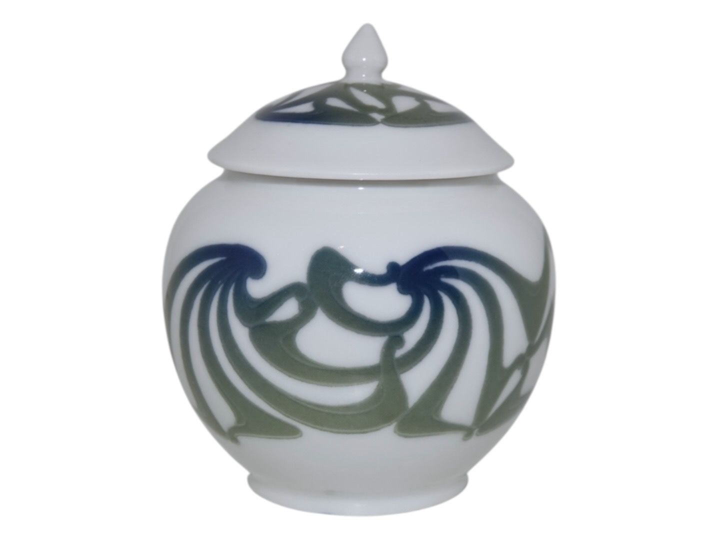 Beskrivelse: Bing & Grøndahl, lille Art Nouveau krukke med grønne og blå farver