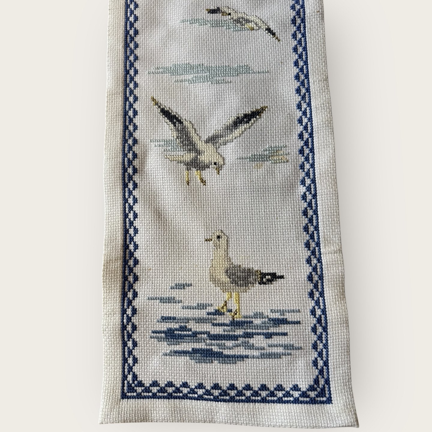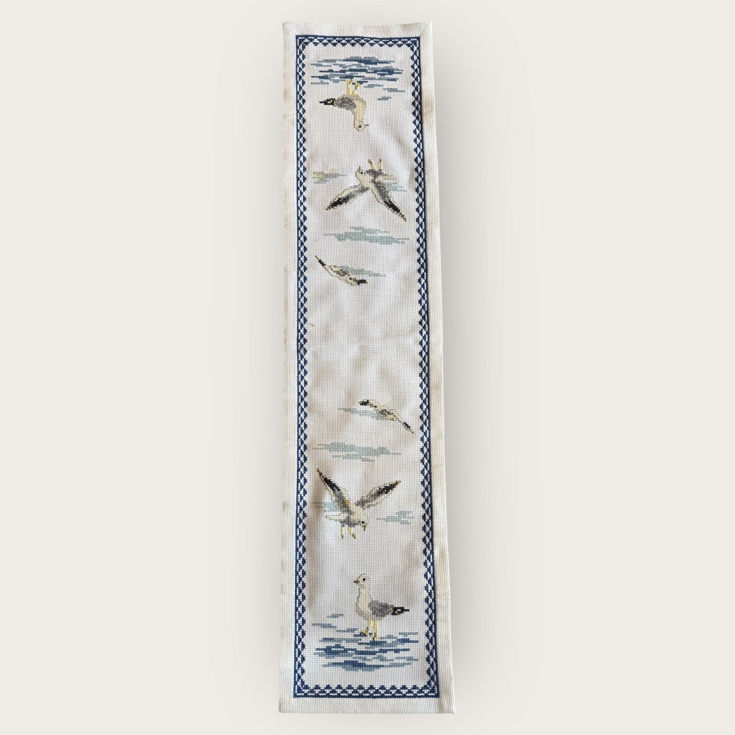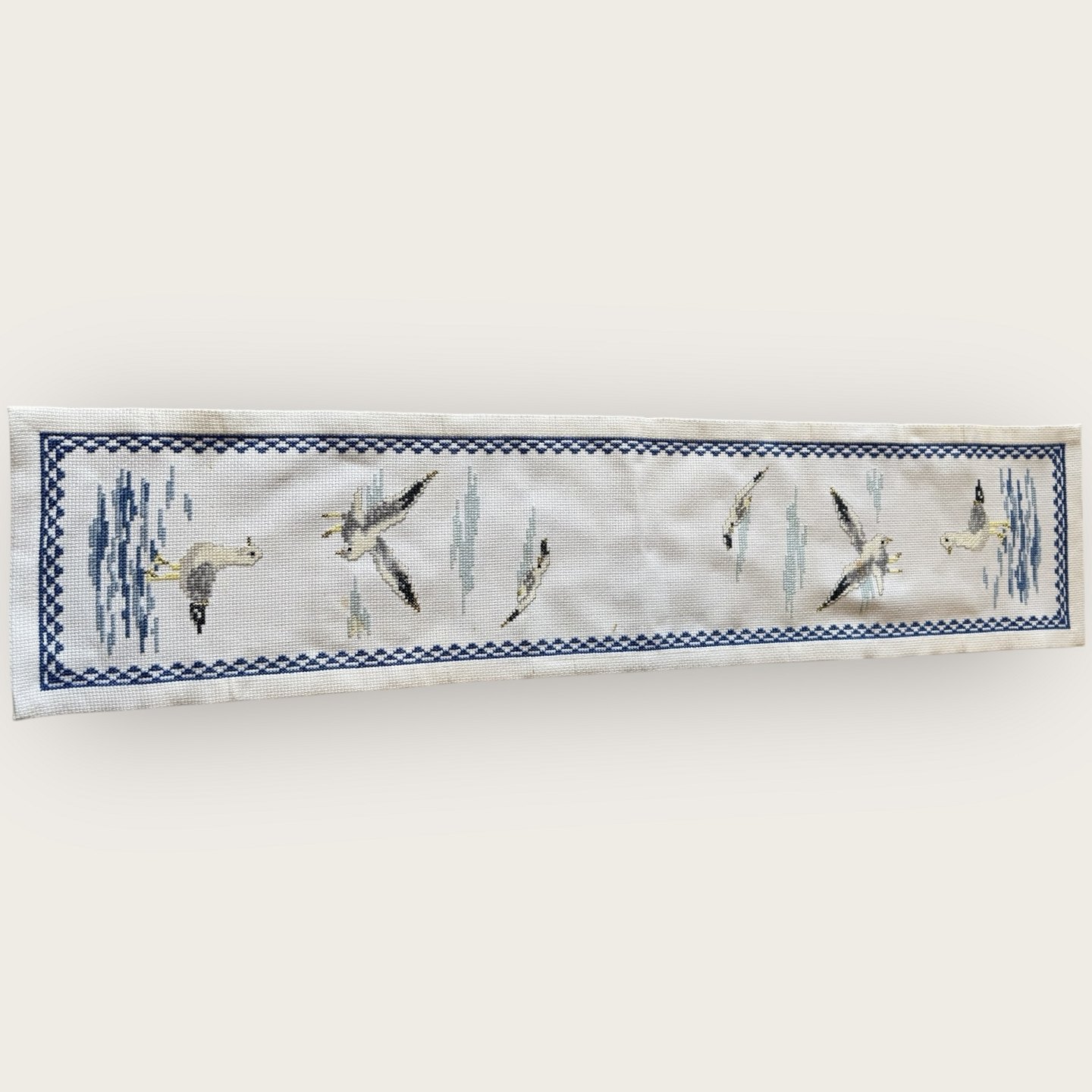 : Håndsyet bordløber med mågemotiv, 90x20cm *fin stand*