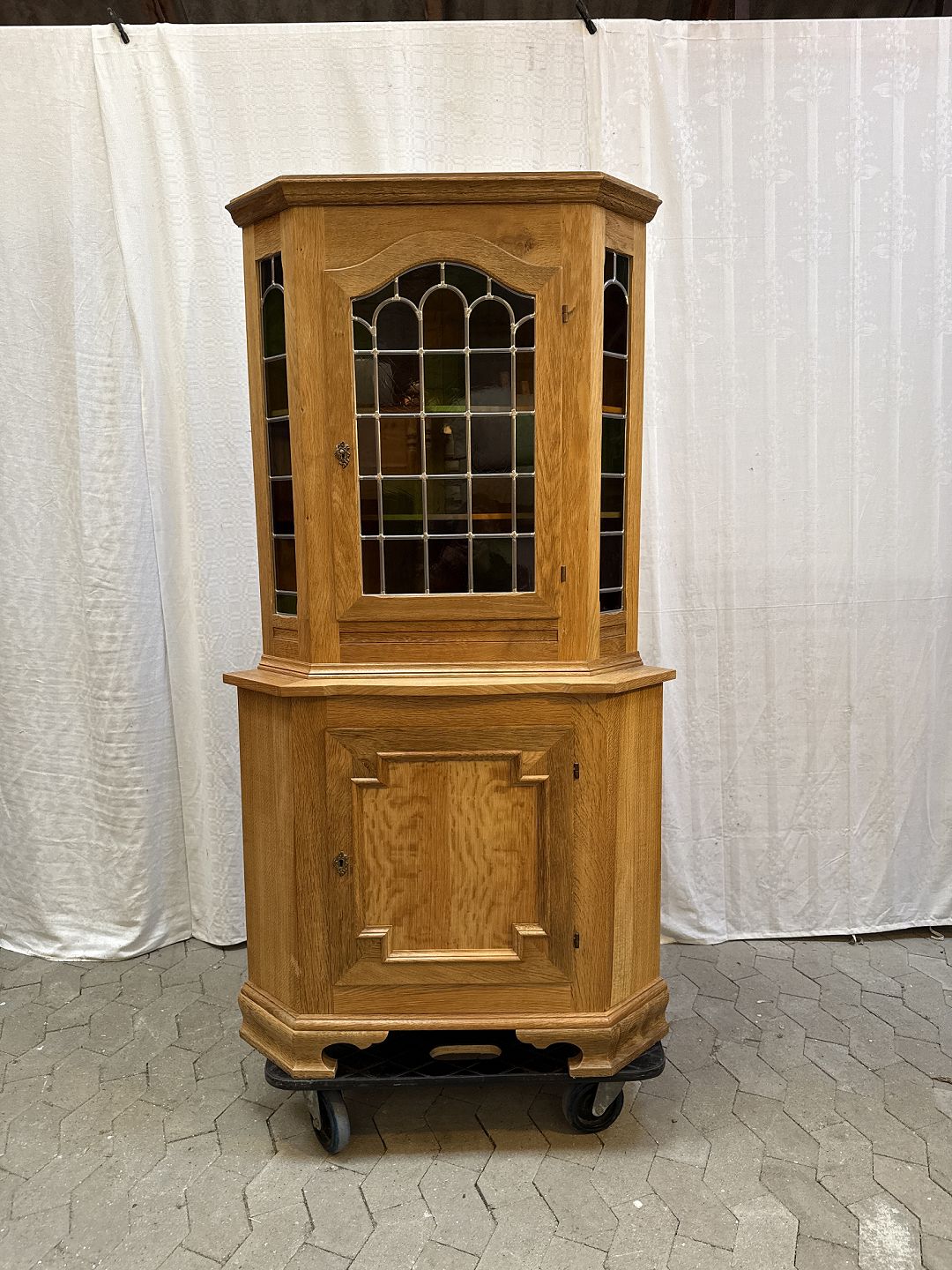 : Hjørneskab i delvis massiv egetræ, fra 1980’erne
