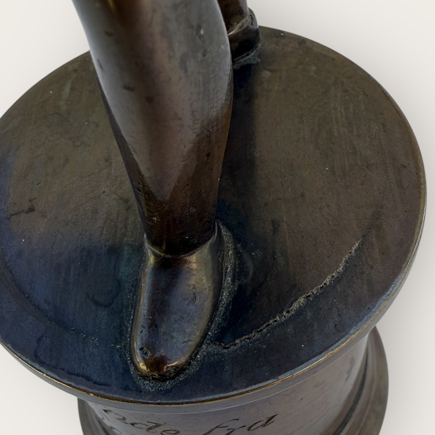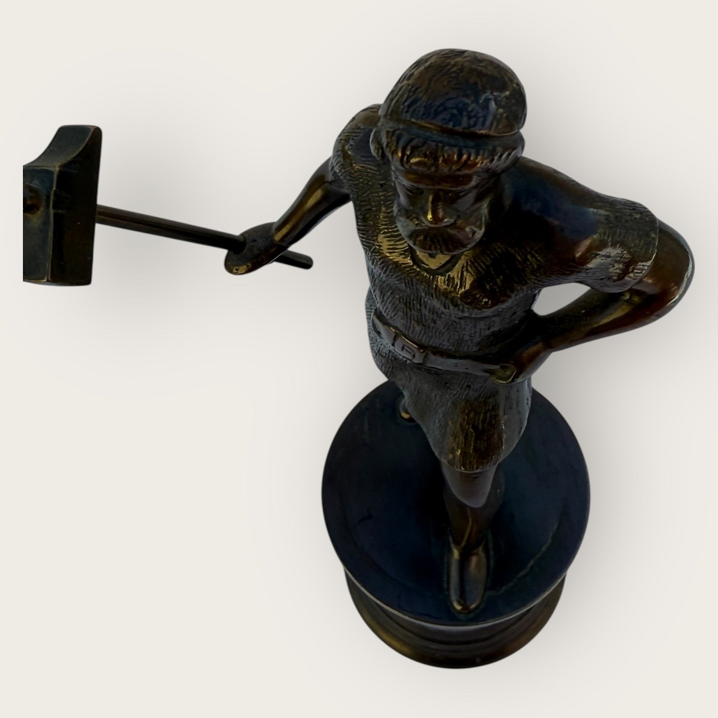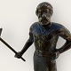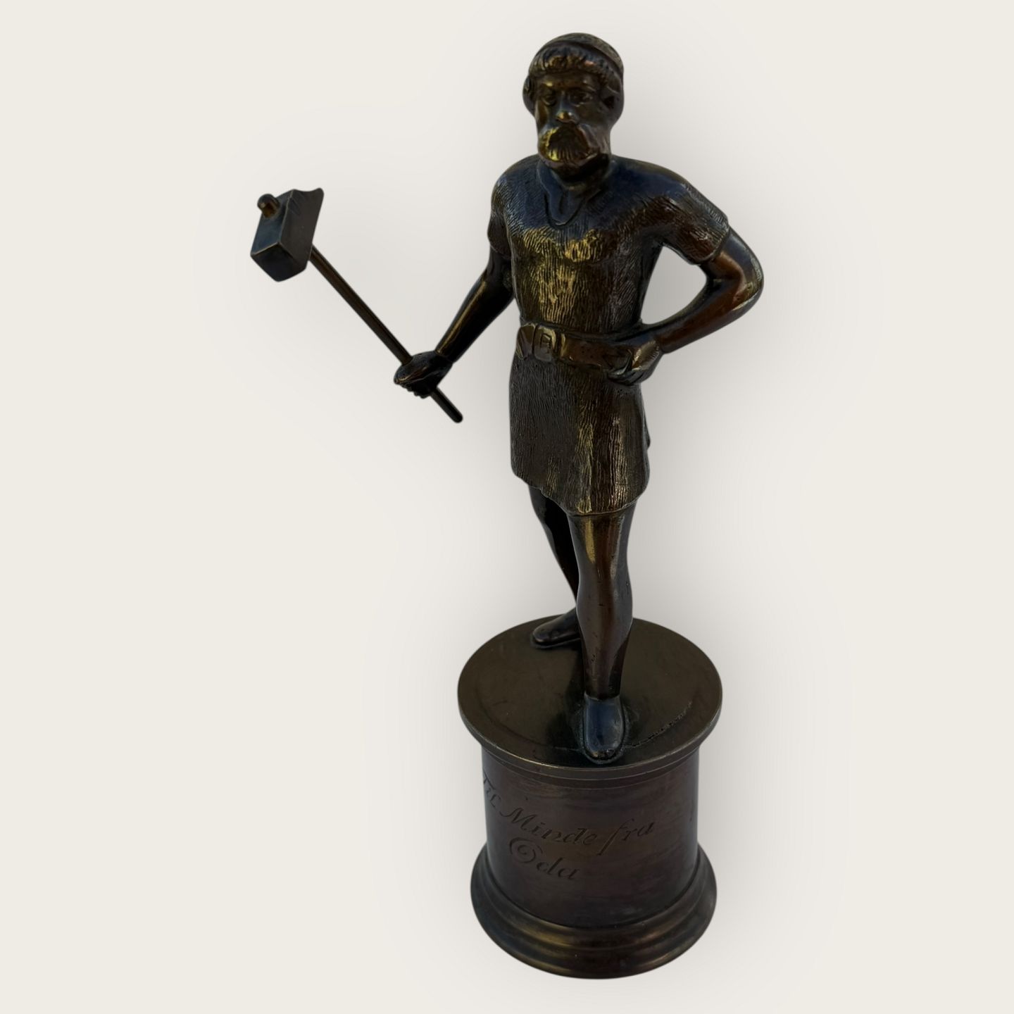 Beskrivelse: Bronze figur af Guden Thor med sin hammer, lille sprække i soklen ved hans fod (se foto) ellers pæn stand, indgraveret: Til minde om Oda, Højde 19cm