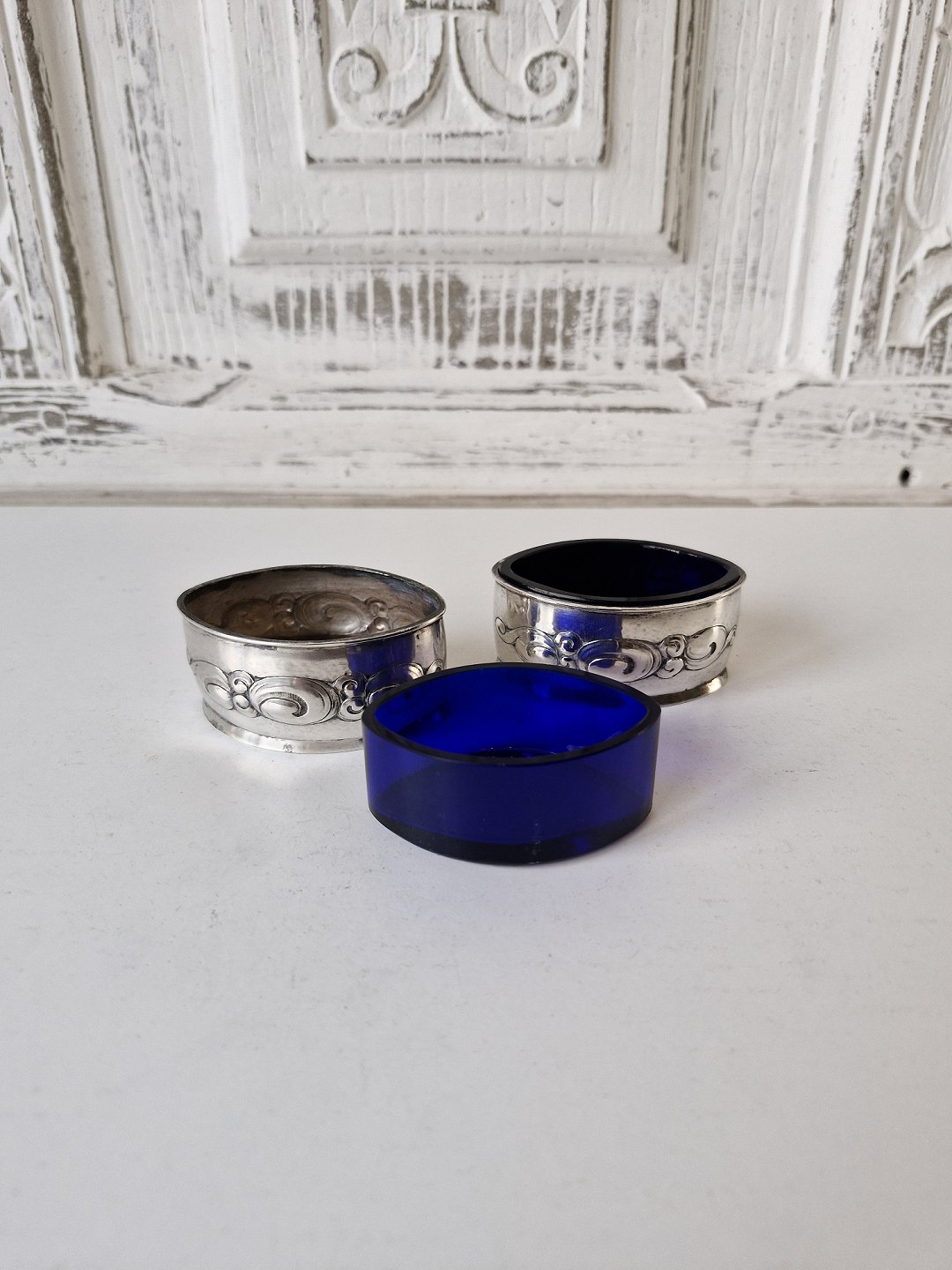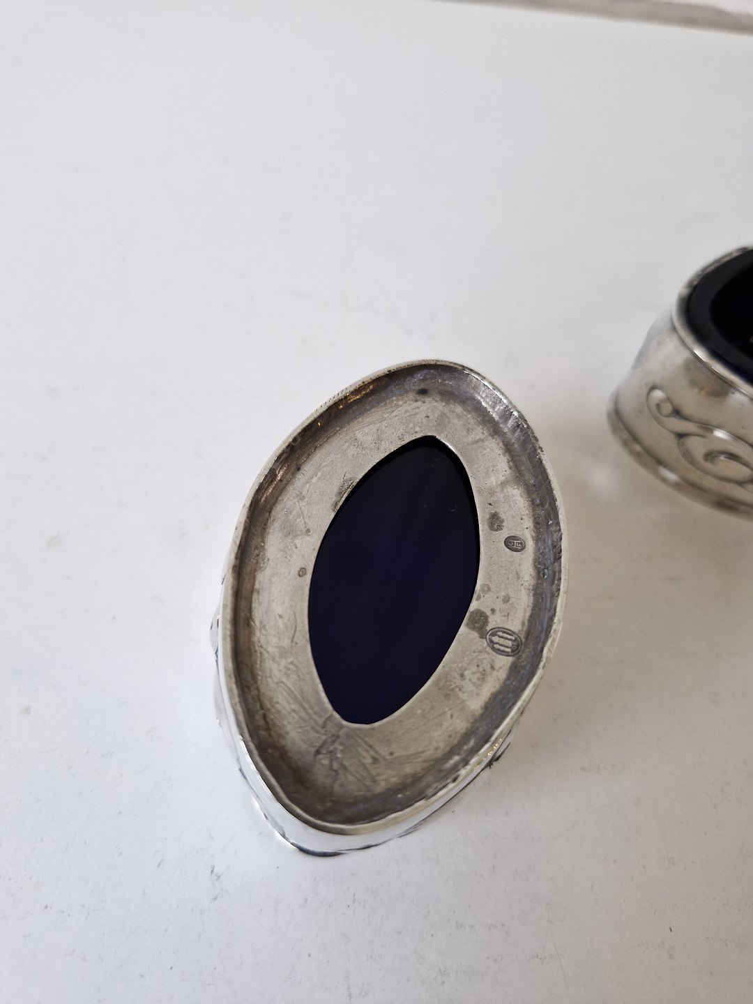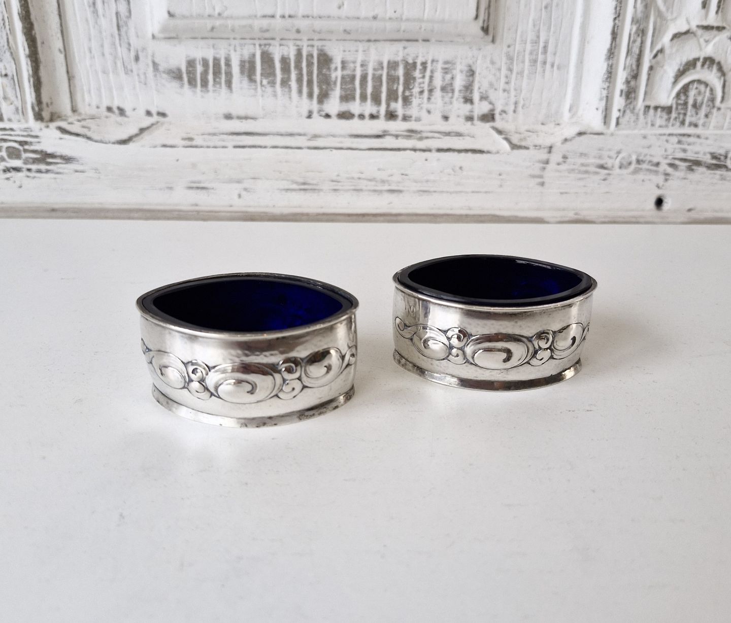 Beskrivelse: Par ovale saltkar i sølv med dekoration i skønvirkestil med indsatser i blåt glas.