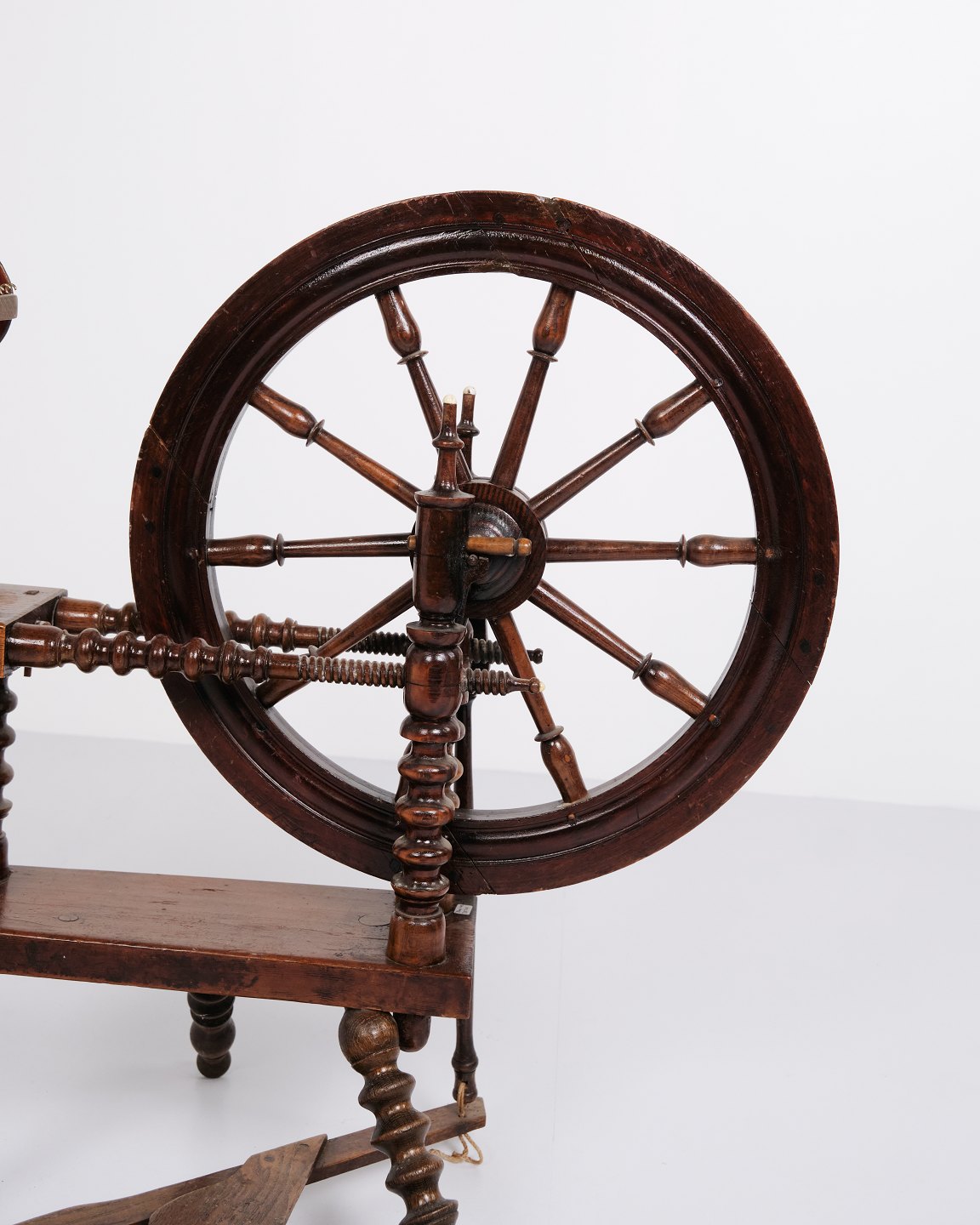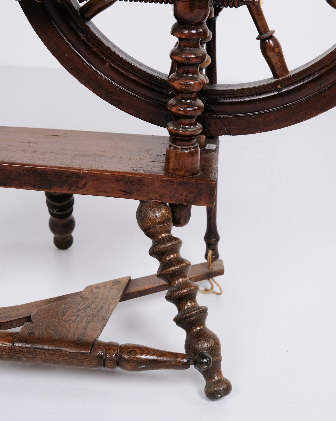 Beskrivelse: Antik spinderok fra 1880’erne i håndpoleret mørkt træ.