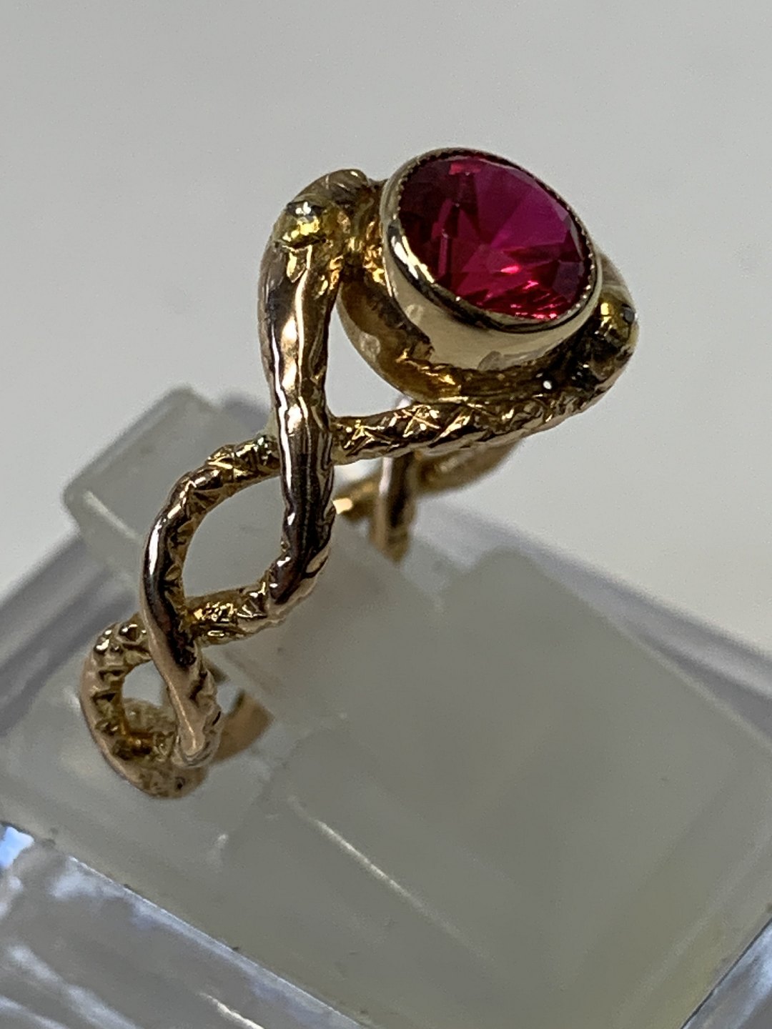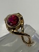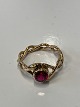 Beskrivelse: Smuk og elegant guldring med flot stor rød sten, og to mindre diamanter. Den røde sten giver ringen liv og styrke, men de to mindre diamanter reflekterer lyset, og giver ringen liv.