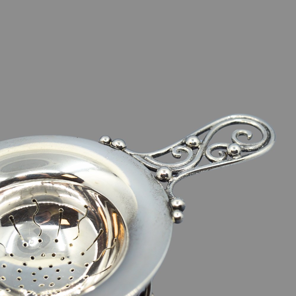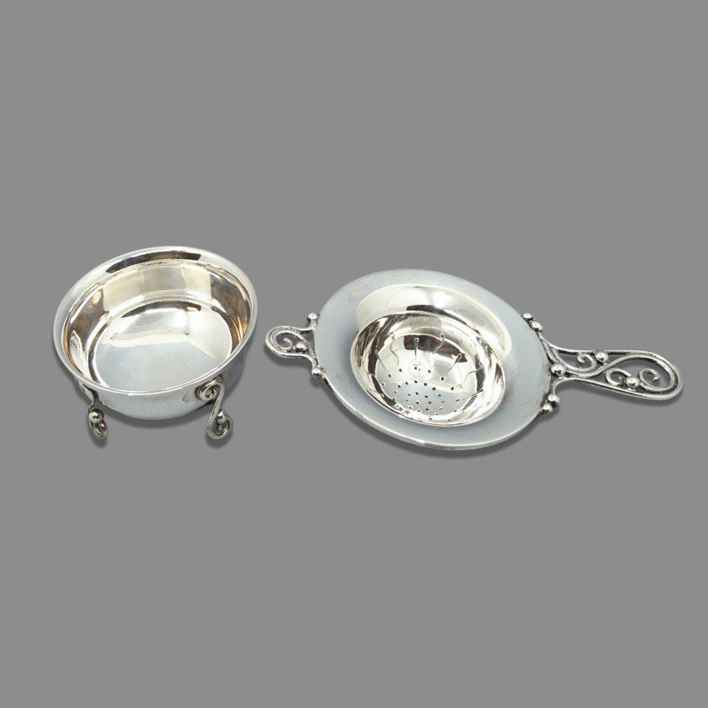 Beskrivelse: Dansk thesi med underskål, begge i sterling sølv. L. 14 cm. B. 7,7 cm.