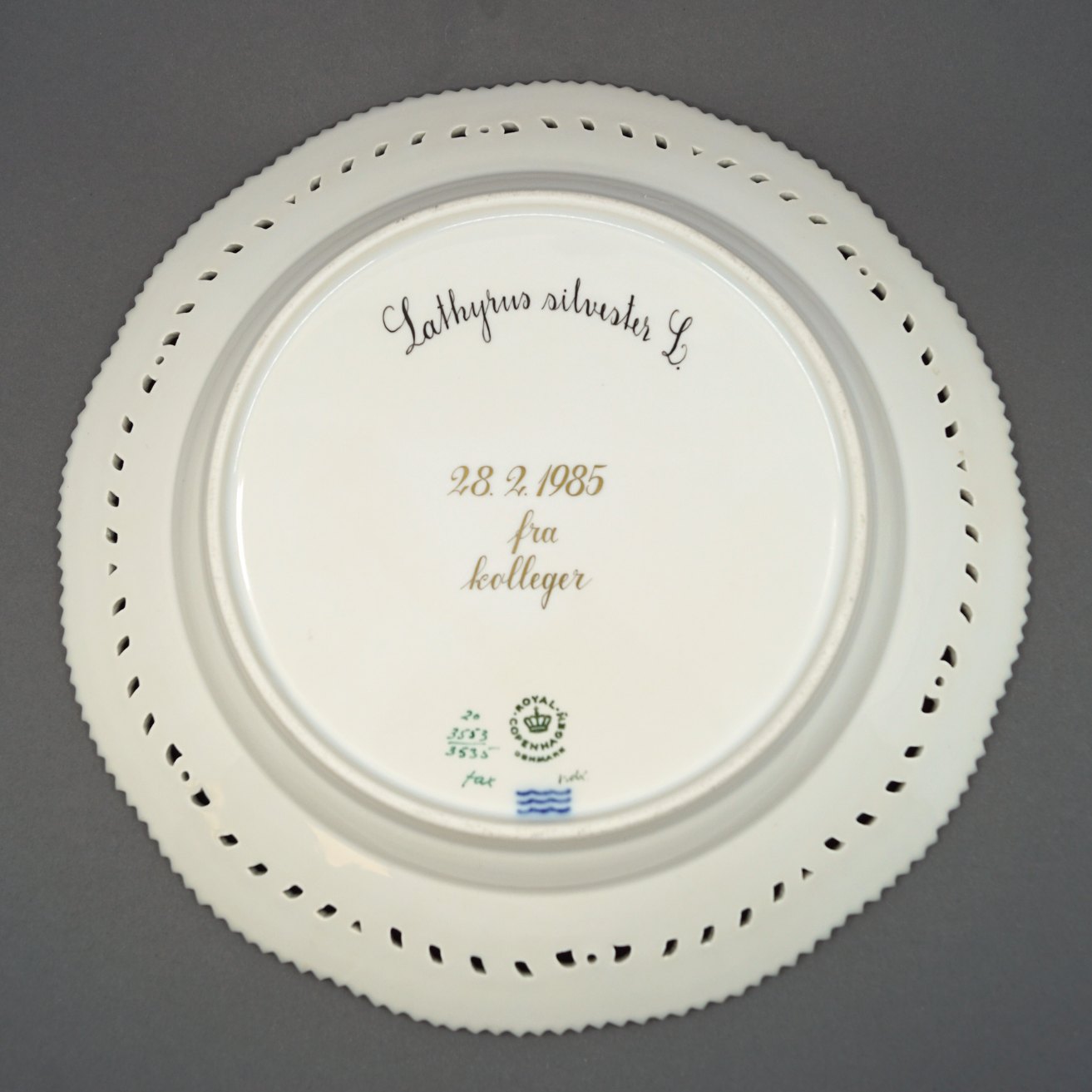 Description: Royal Copenhagen, Flora Danica porcelain; Dinner plate #3553 with pierced border. Decoration: Lathyrus silvester L. Decorated in colours and gold with flowers. Diam 25 cm.