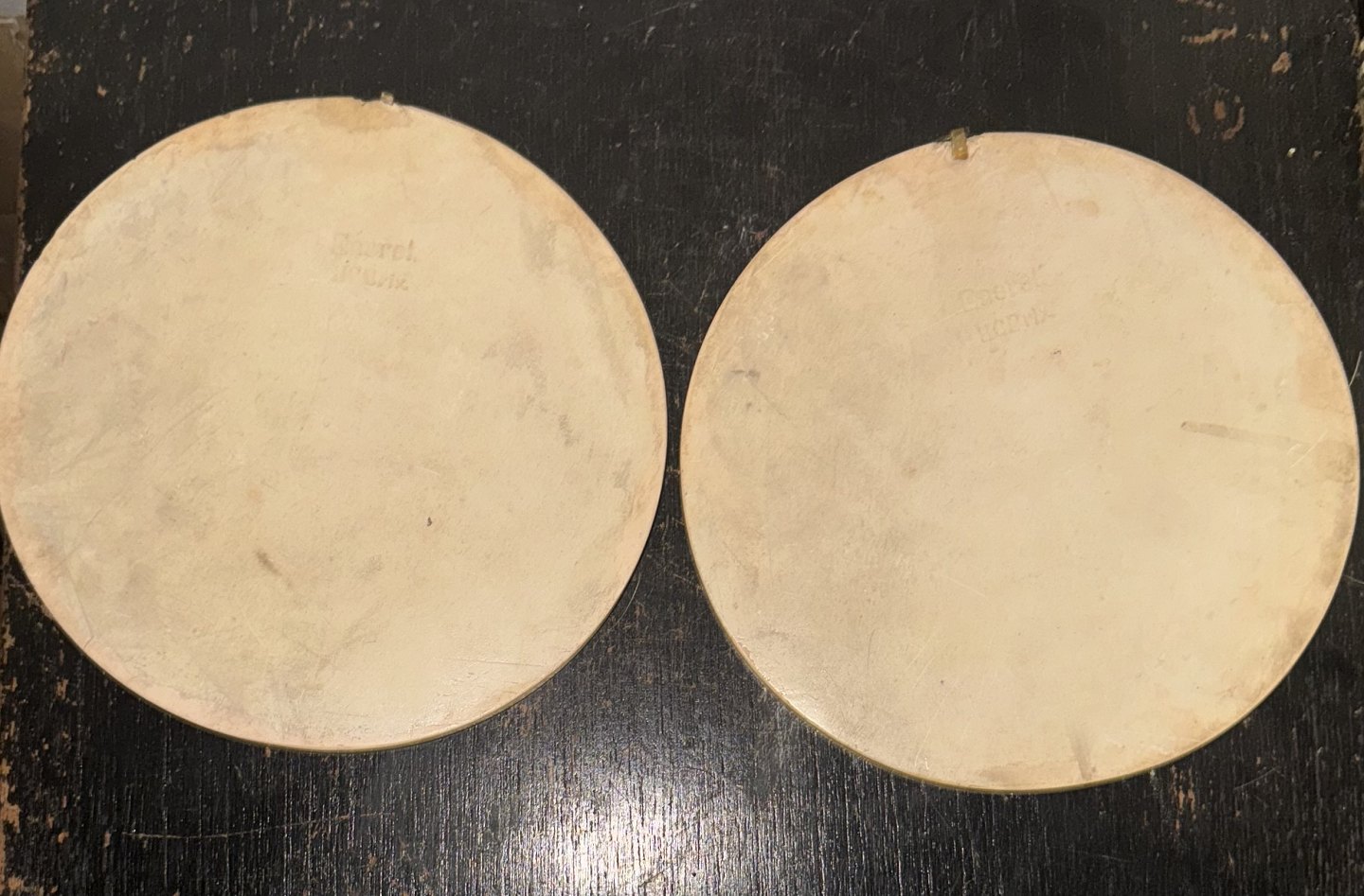 Beskrivelse: Par platter med motiv af Bertel Thorvaldsens “Natten & Dagen” i relief. Udført på Hans Christian Brix (1831-1907) værksted i gips i slutningen af 19. Århundrede. For at fremhæve relieffet er bunden malet Bordeaux. Platten fremstår i god stand med få brugsspor på bagsiden, hvor producentens navn er påstemplet - H. C. Brix. Diameter 18,3 cm