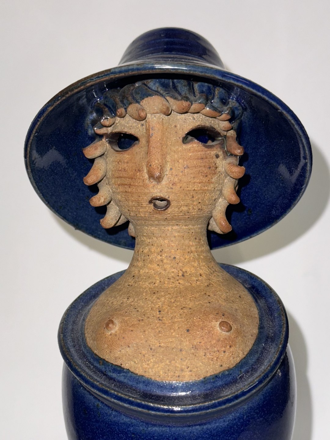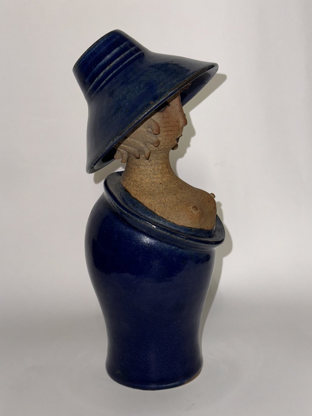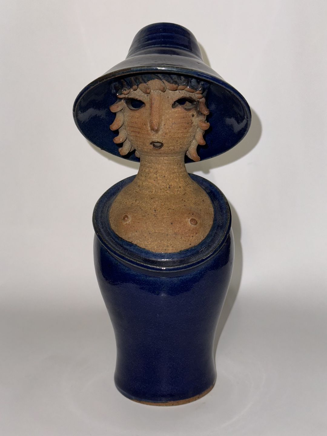 Beskrivelse: Figur i keramik af kvinde med hat. Fremstår i god stand uden skader. Designet af Jacob Bang, der skabte flere lignende figurer i forskellige positurer. Denne udgave med blå glasur. Hul i ryggen til eksempelvis blomster. Stemplet på bunden med kunstnernavn samt modelnummer 14 samt DANMARK. H. 21 cm
