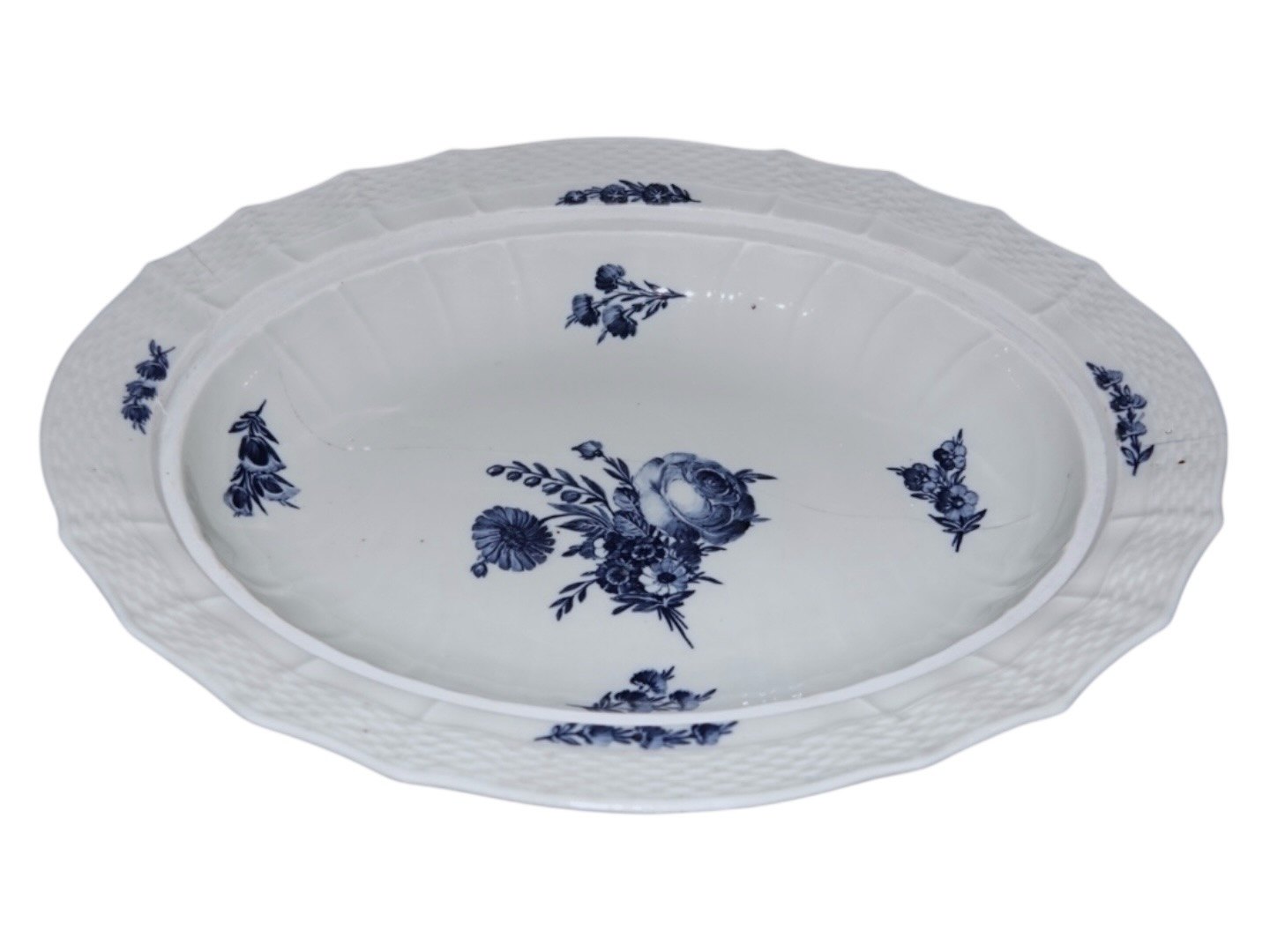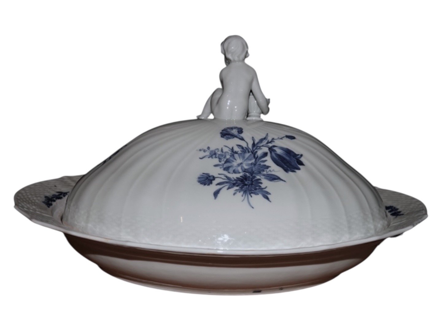 Description: Royal Copenhagen Blue Flower Curved, extra large and rare lidded bowl with a boy figurine on top. It is an early piece that is grey in the porcelain instead of white.