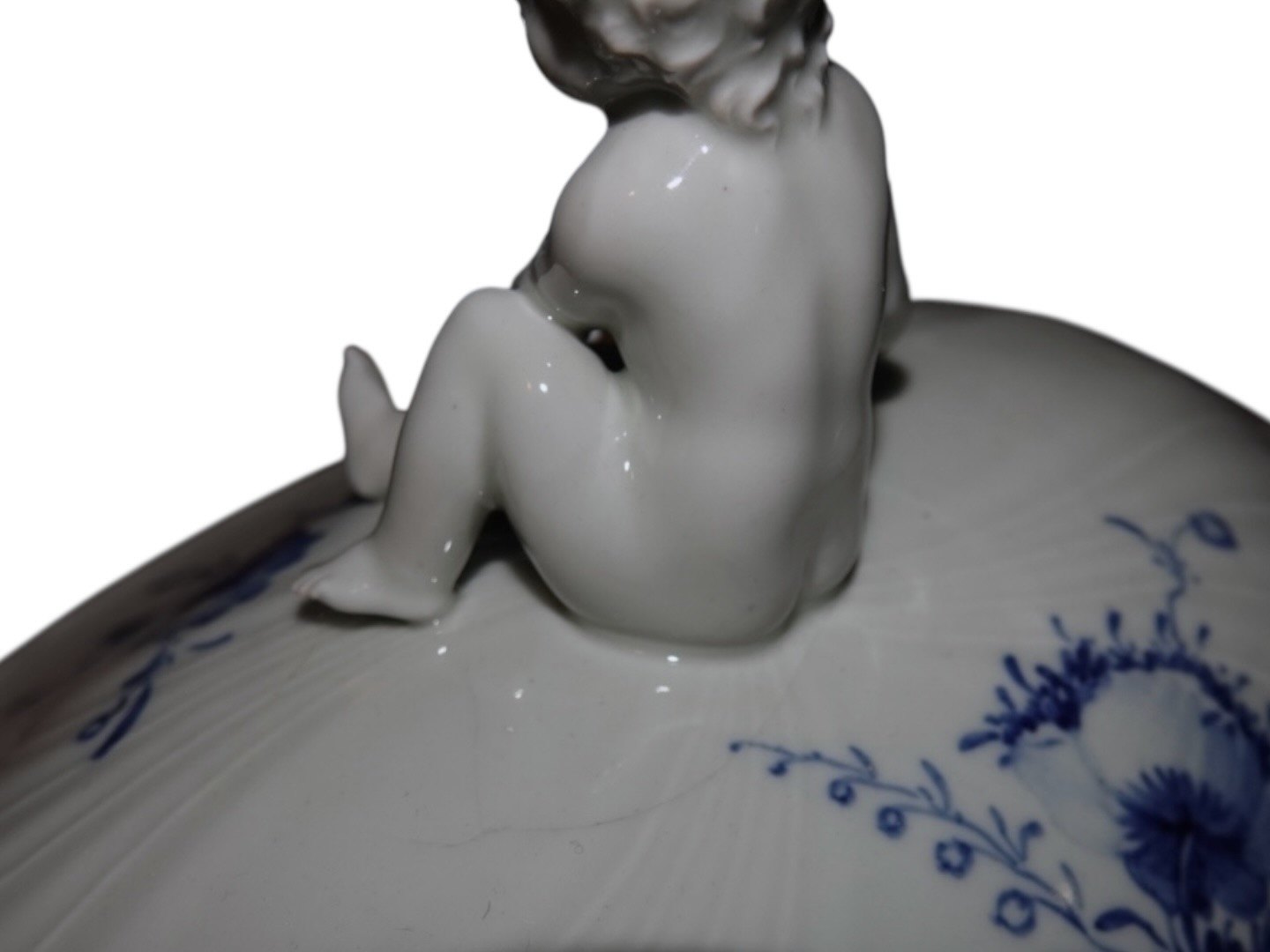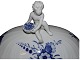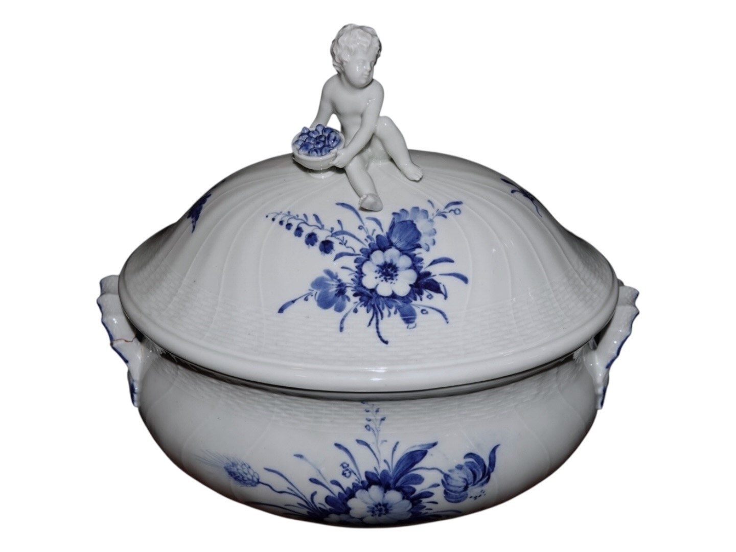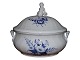 Beskrivelse: Royal Copenhagen Blå Blomst Svejfet, ekstra stor suppeterrin med låg med figur af dreng (putto). Det er en tidlig udgave, hvor porcelænet er gråt fremfor hvidt.