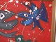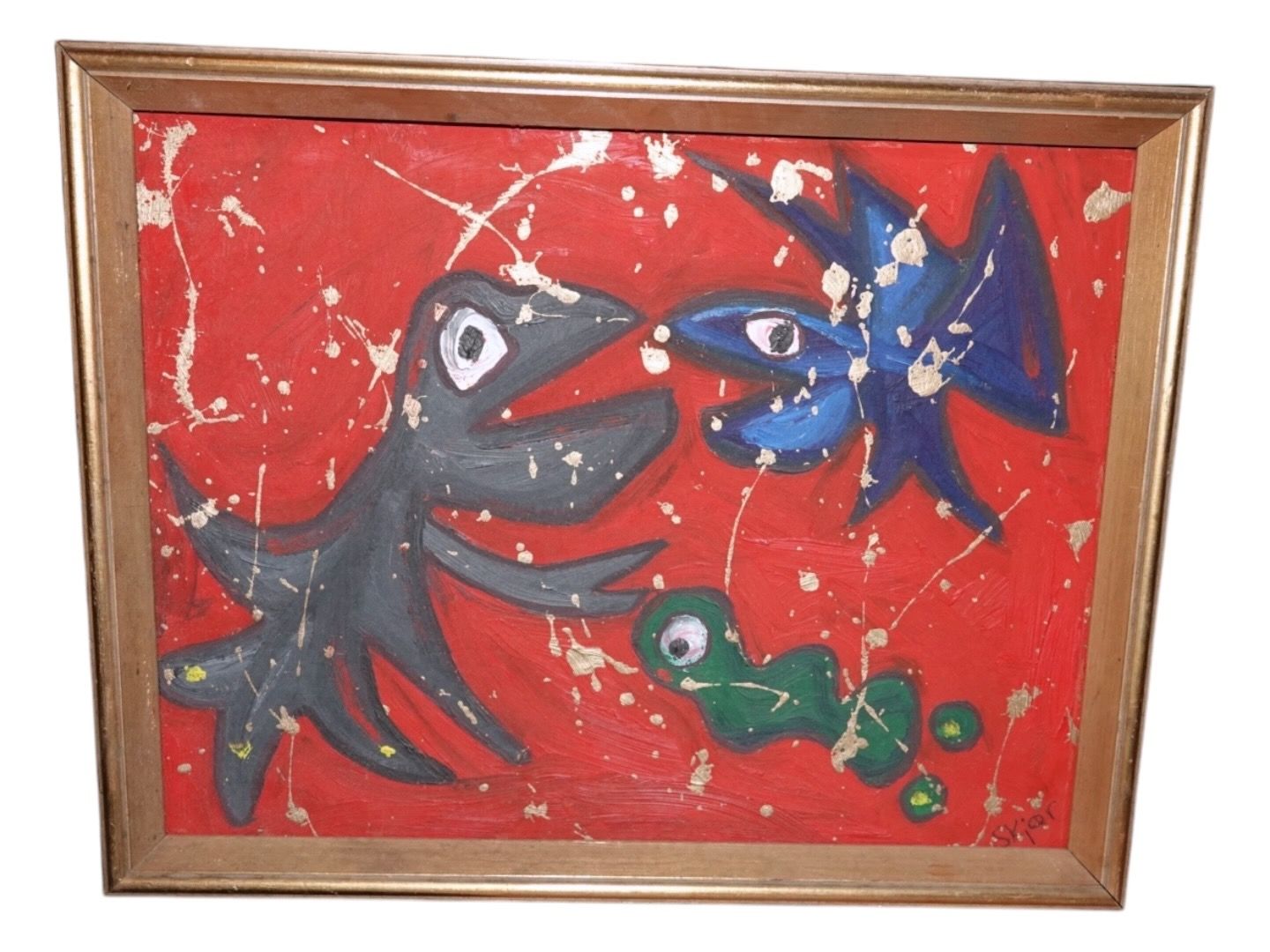 Beskrivelse: Susanne Kjær, moderne rødt oliemaleri med fisk.