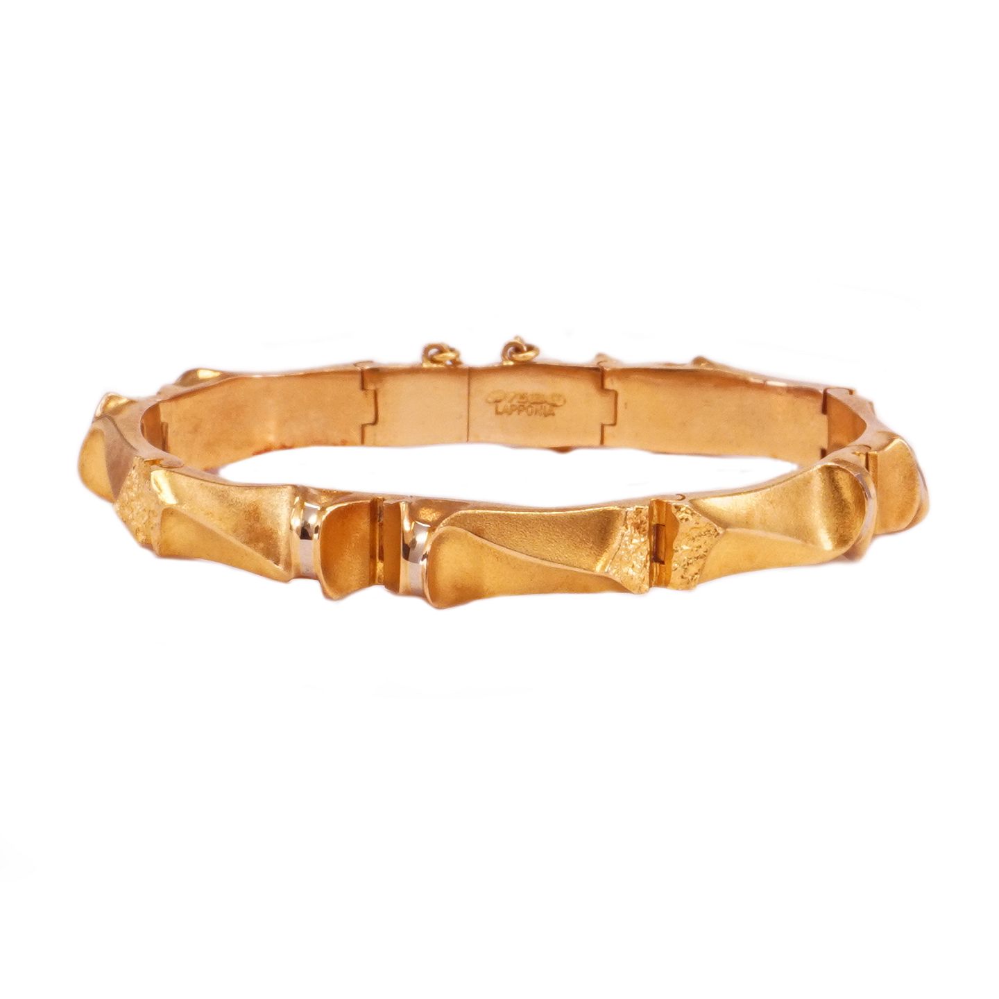 Lapponia 18kt guld leddelt armlænke med kasse- og sikkerhedslås og -kæde år 1980. L: 18,5cm
