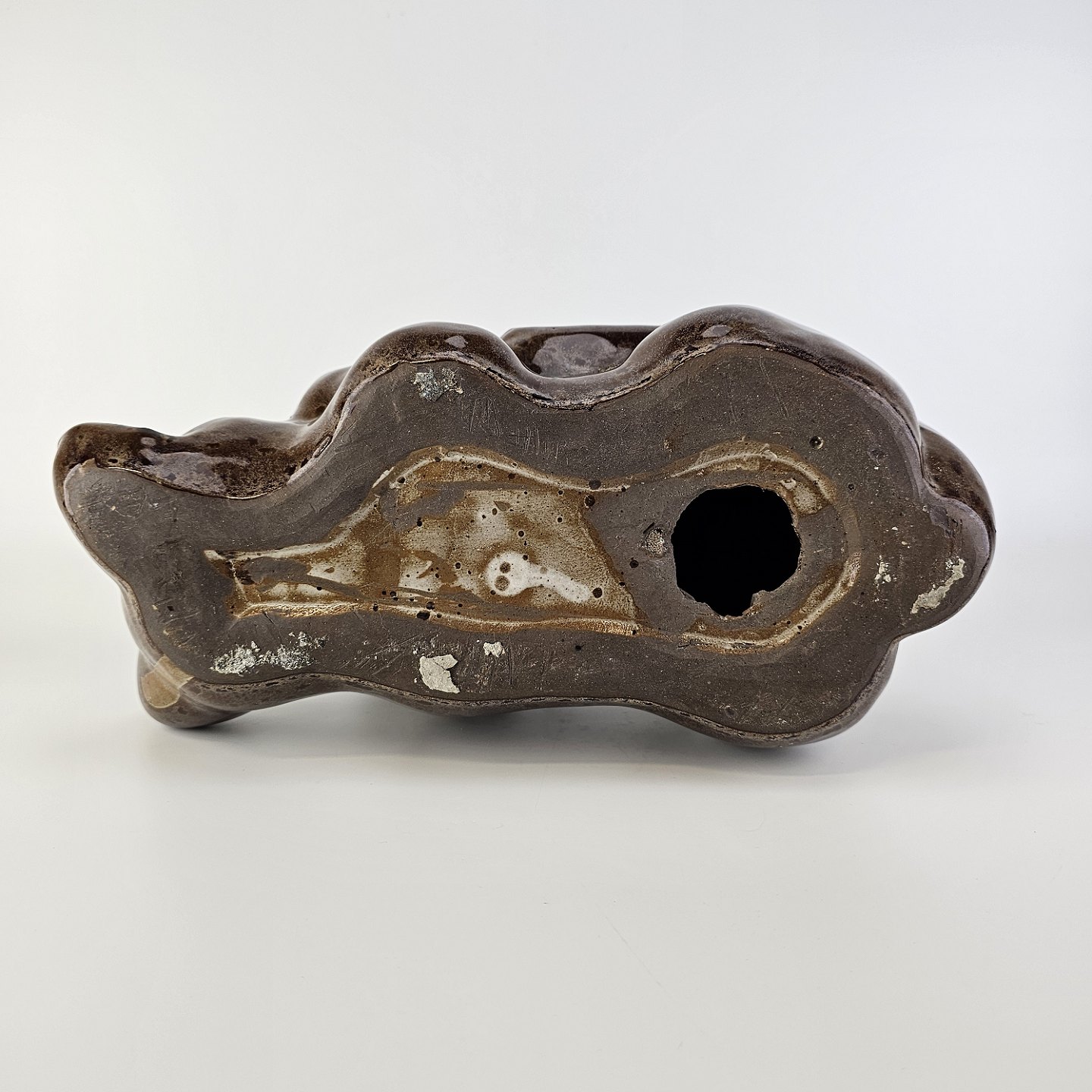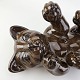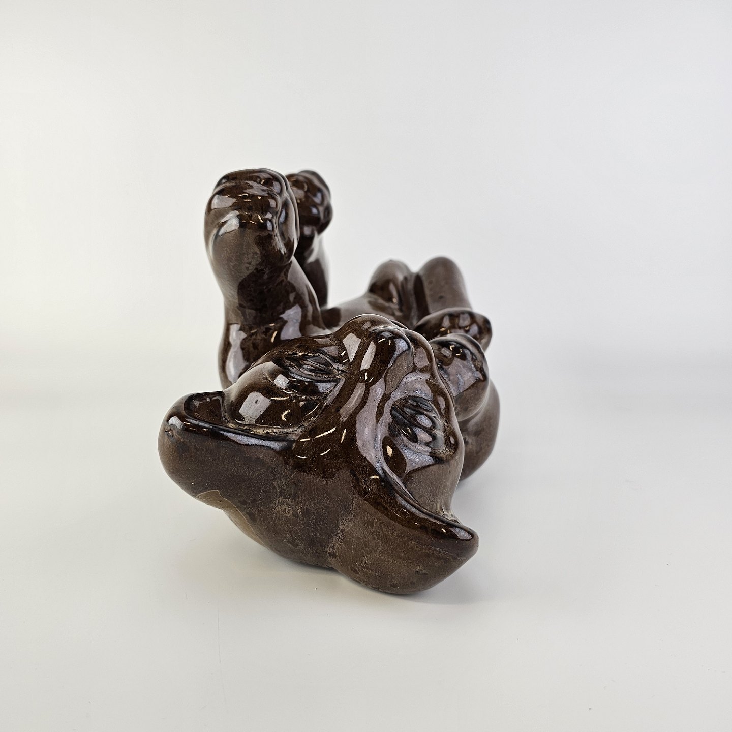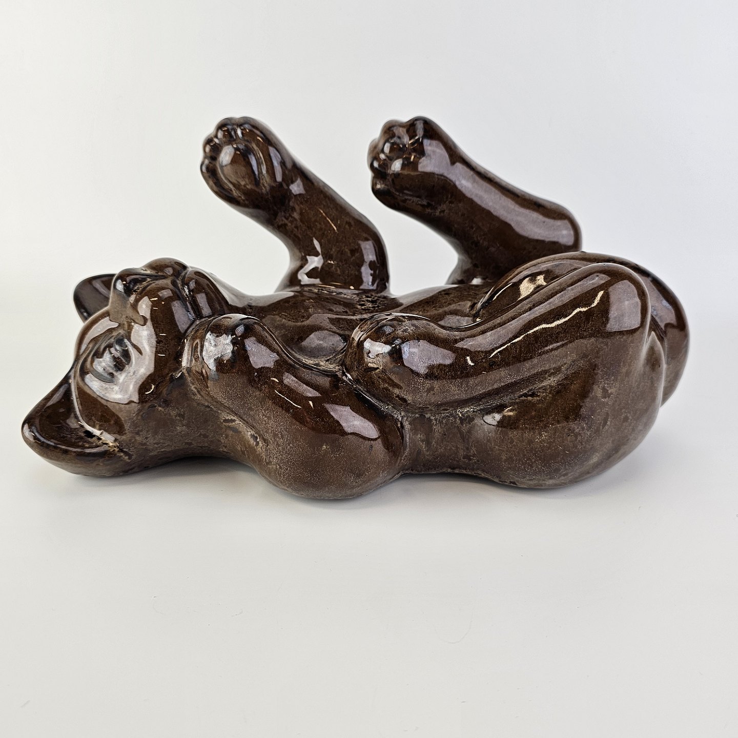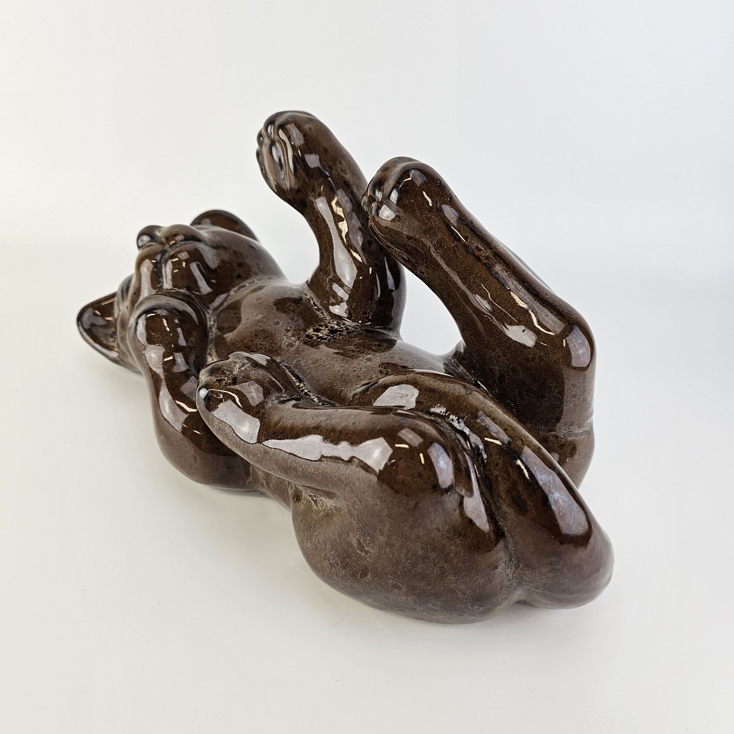 Beskrivelse: Figur i brunt glaseret lertøj med motiv af en kat som ligger på ryggen