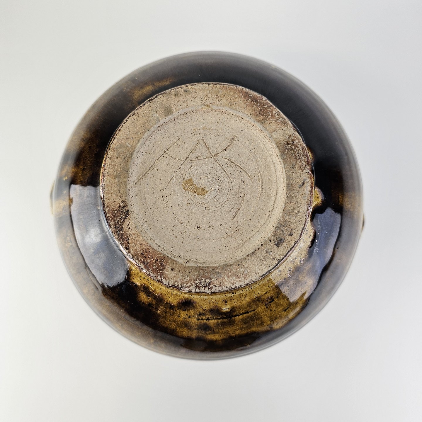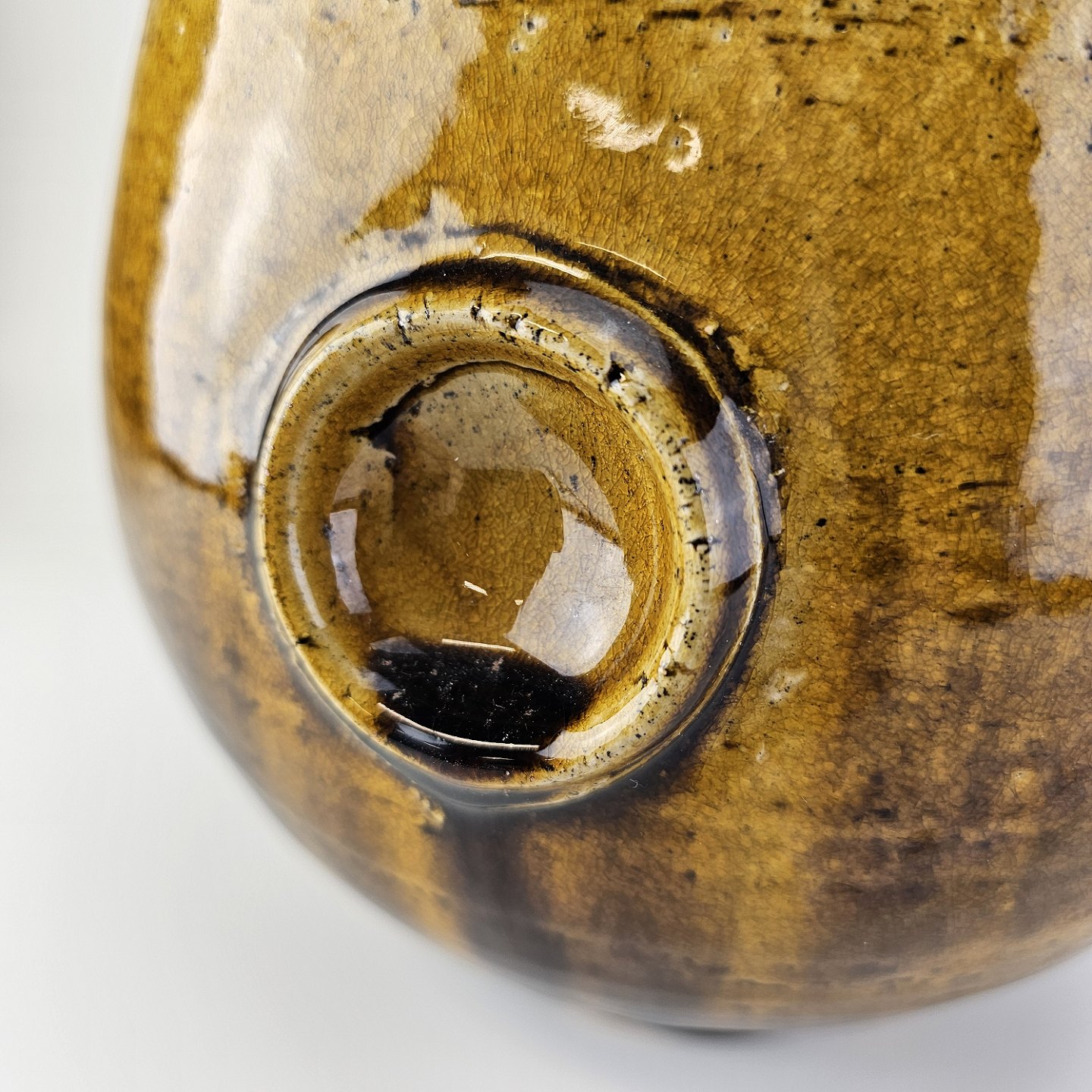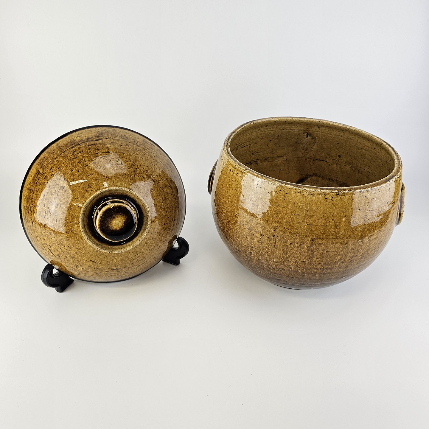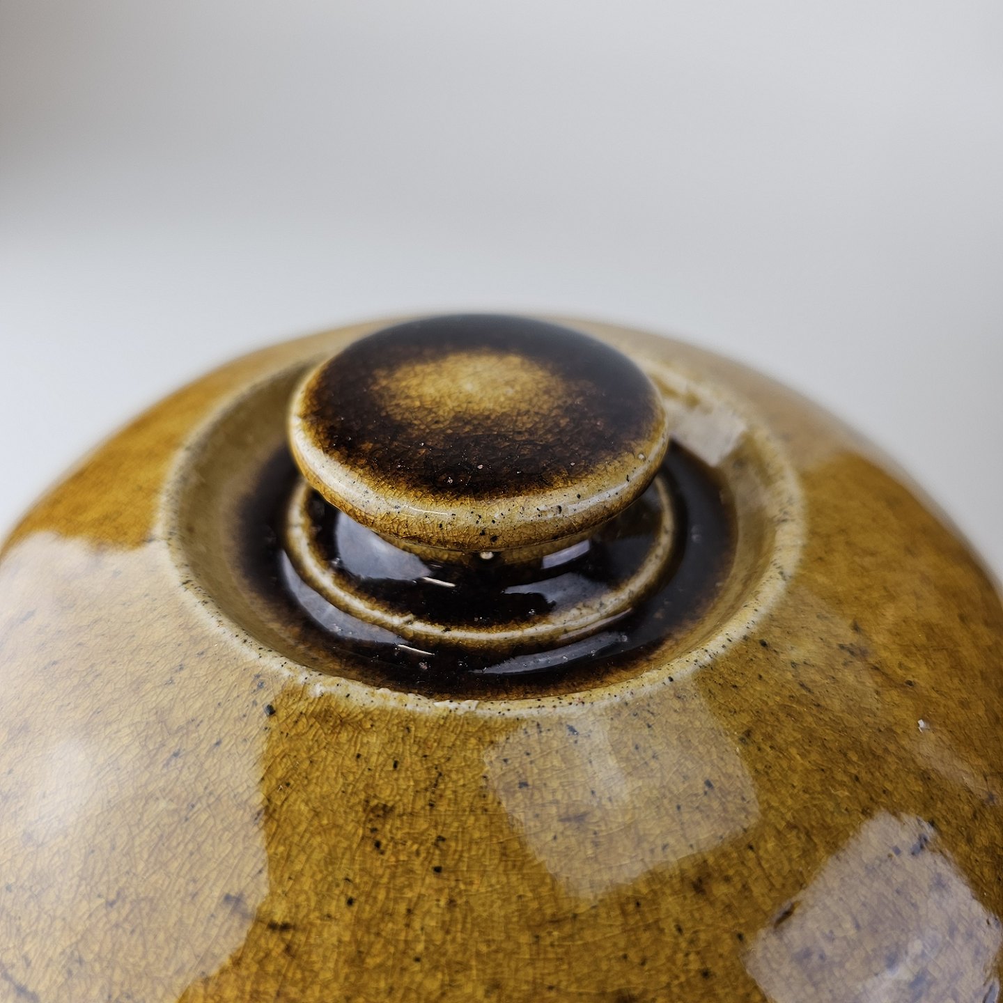 Beskrivelse: Æggeformet krukke med låg i brun glaseret keramik