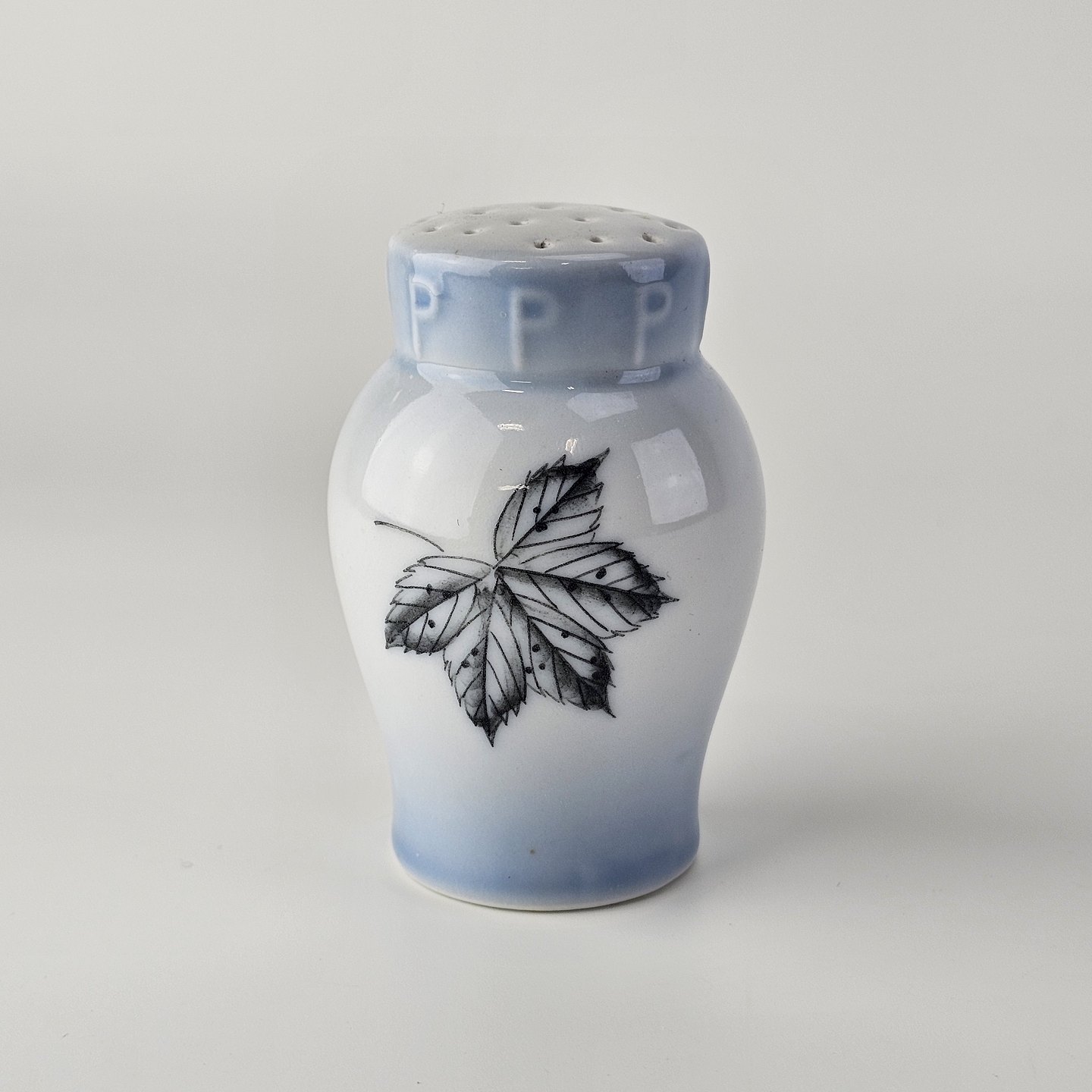 Beskrivelse: Peberbøsse i porcelæn fra stellet Løvfald