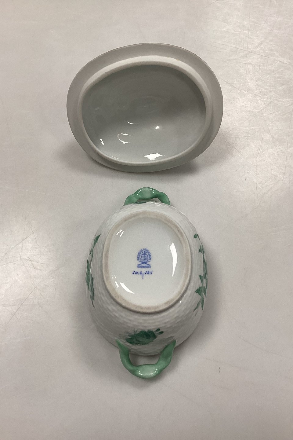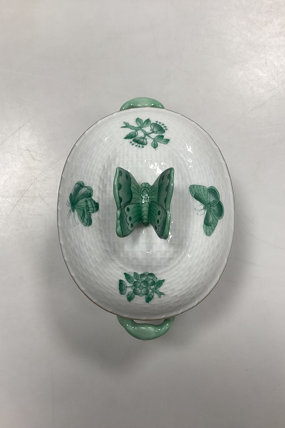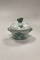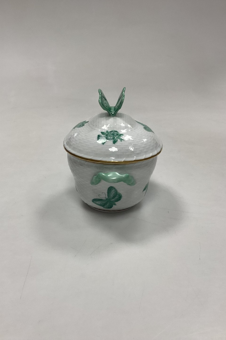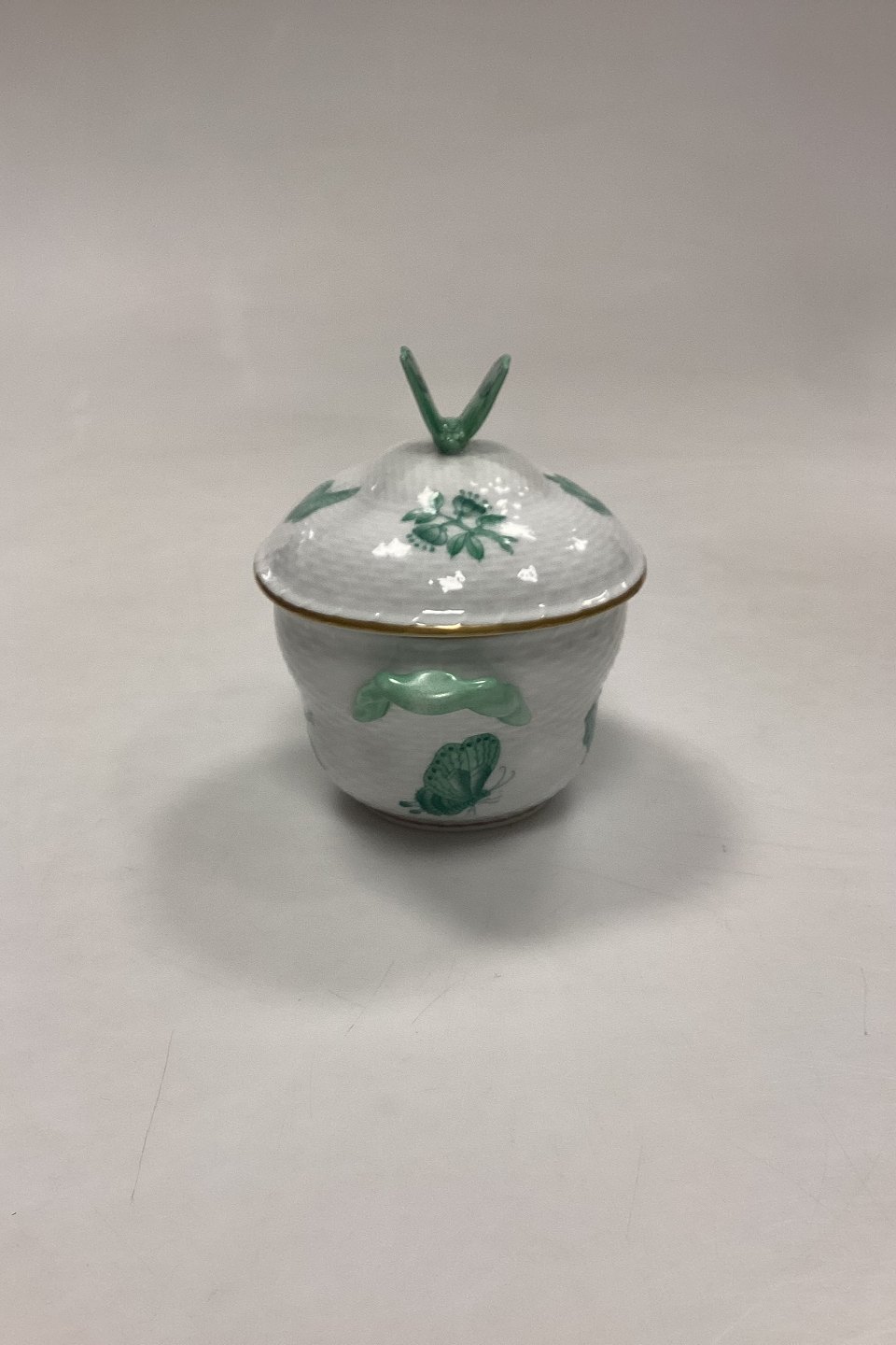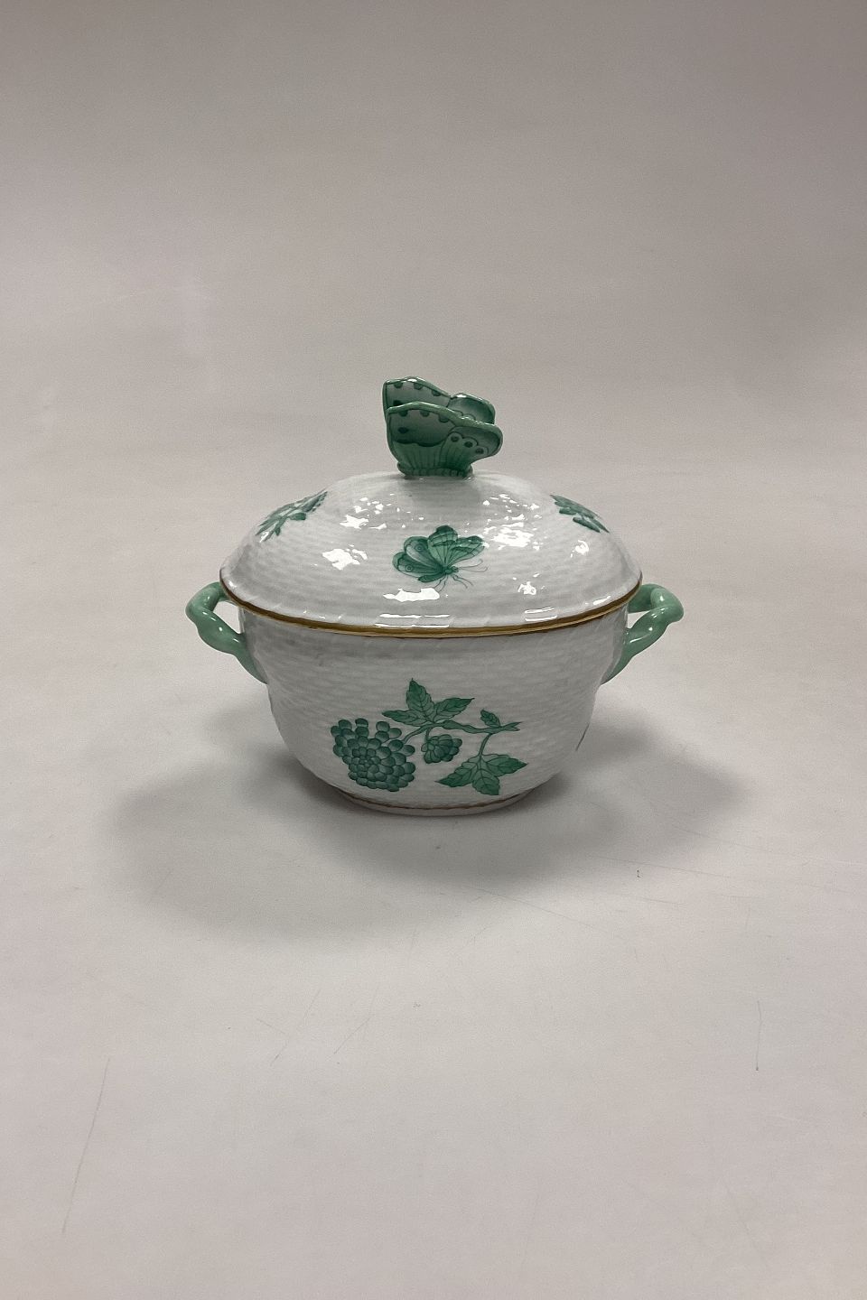 Description: Herend Chinese Bouquet Green Lidded Bowl No. 6018/VAV. Measures 11 cm / 4.33 in. with butterfly x 13.5 cm / 5.31 in. with handle.