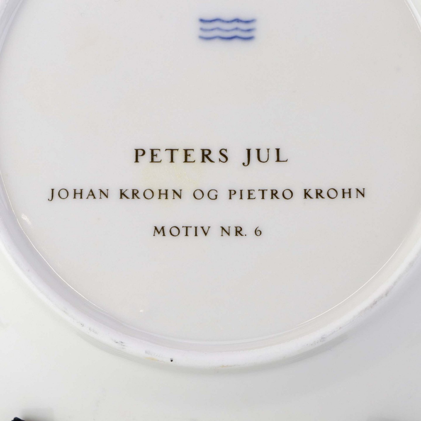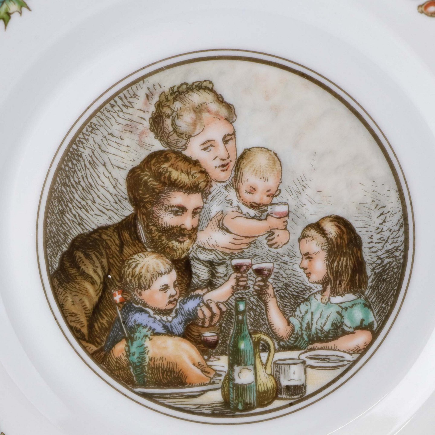Beskrivelse: Flad desserttallerken i kongeligt porcelæn fra serien Peters Jul med motiv af julebordet med familien. Nr. 6
