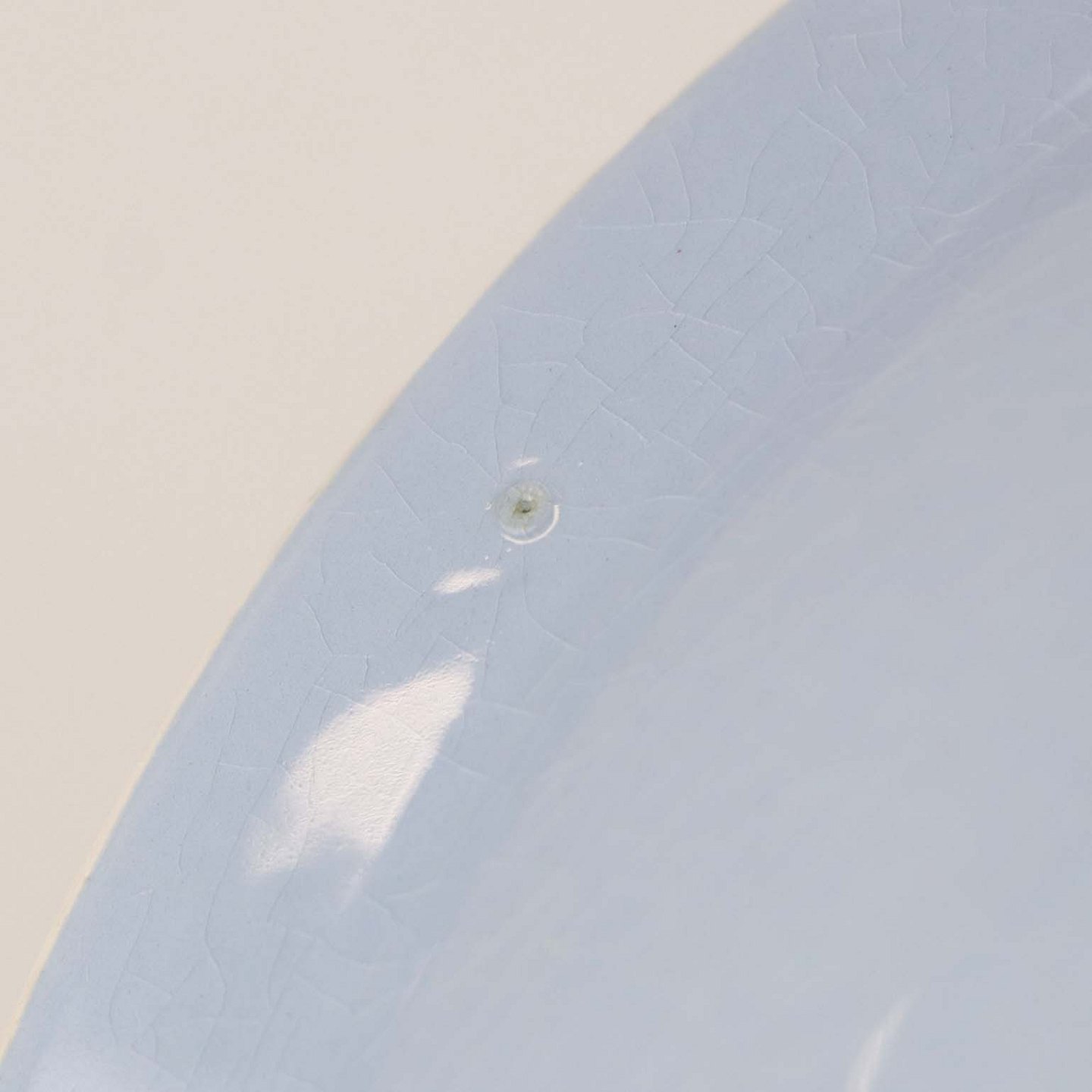 Service i lyseblå fajance dekoreret med tynd hvid kant.