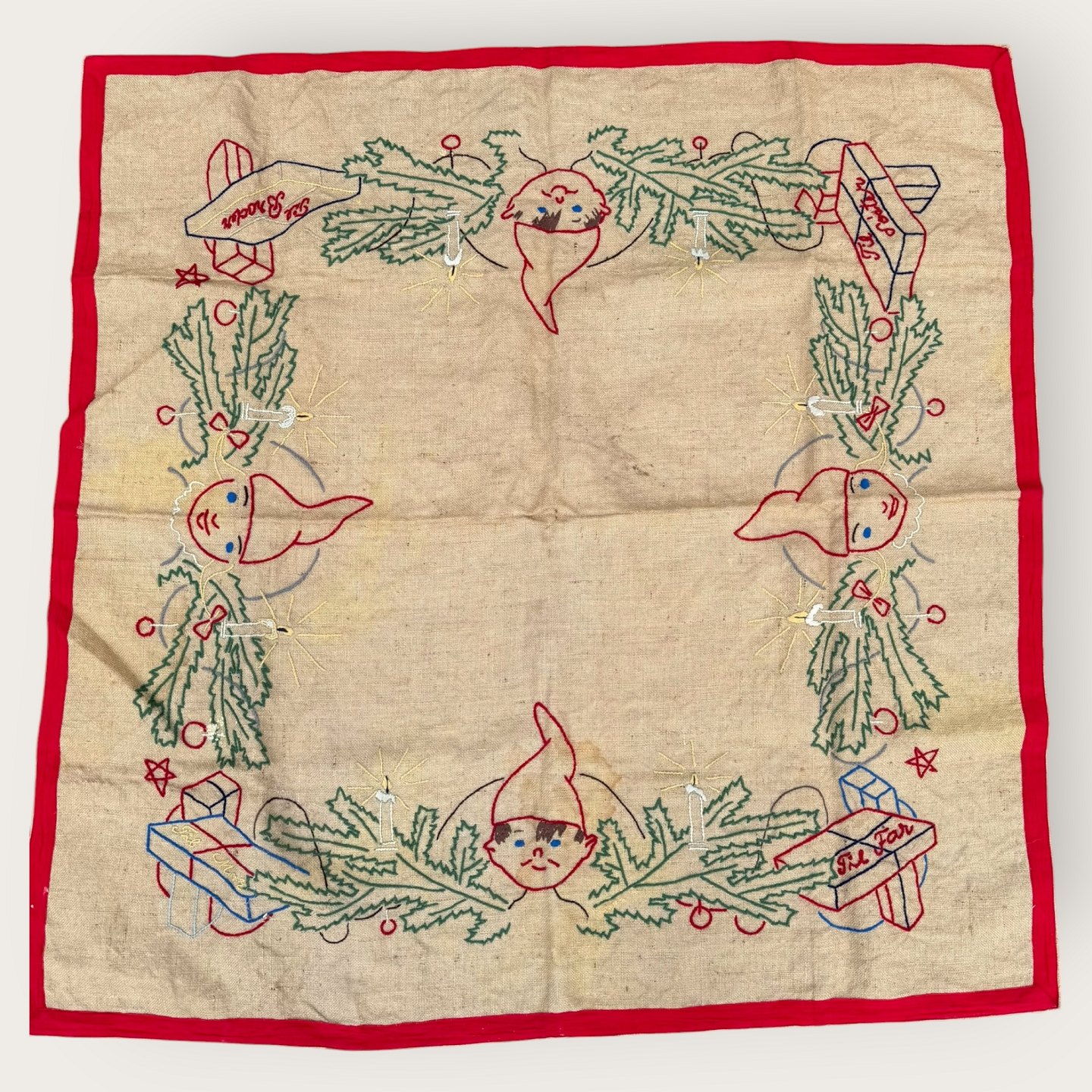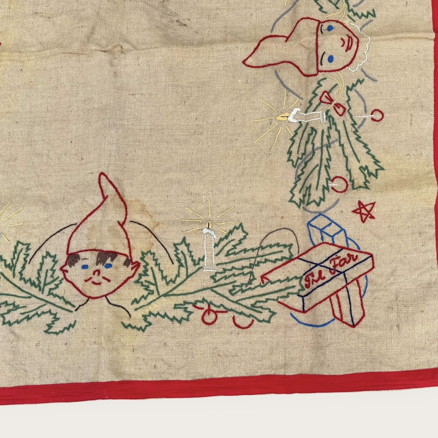 Beskrivelse: Juletræstæppe, Broderi med julemotiv, 120cm / 120cm *Pænt patineret stand*