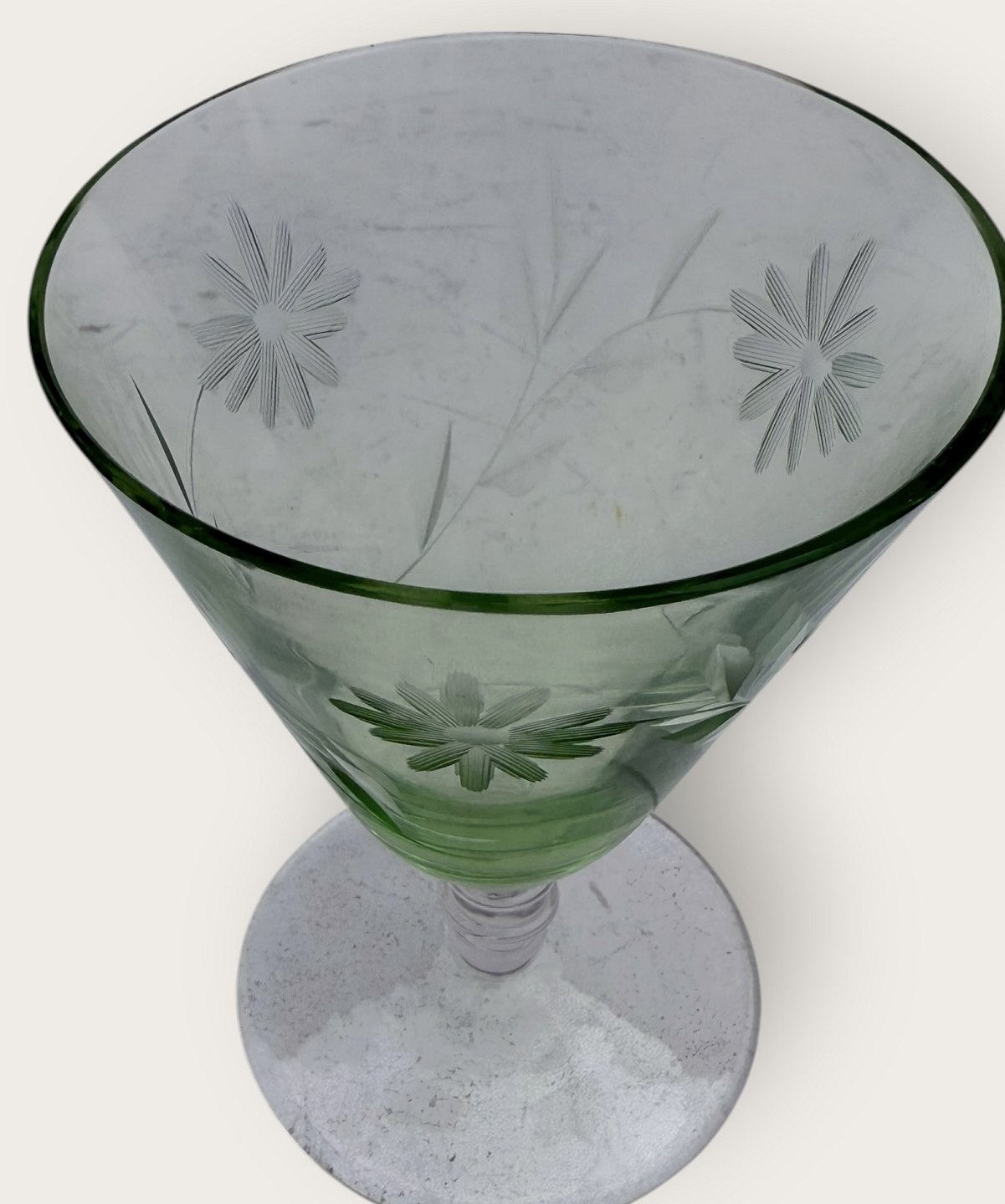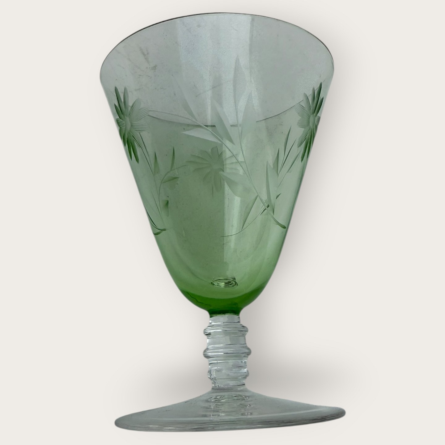 Beskrivelse: Grønne hvidvinsglas med blomsterslibninger, Højde 10,5cm, diameter 7,5cm *pæn stand*